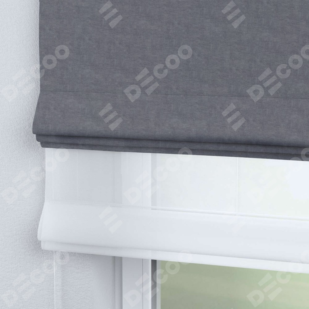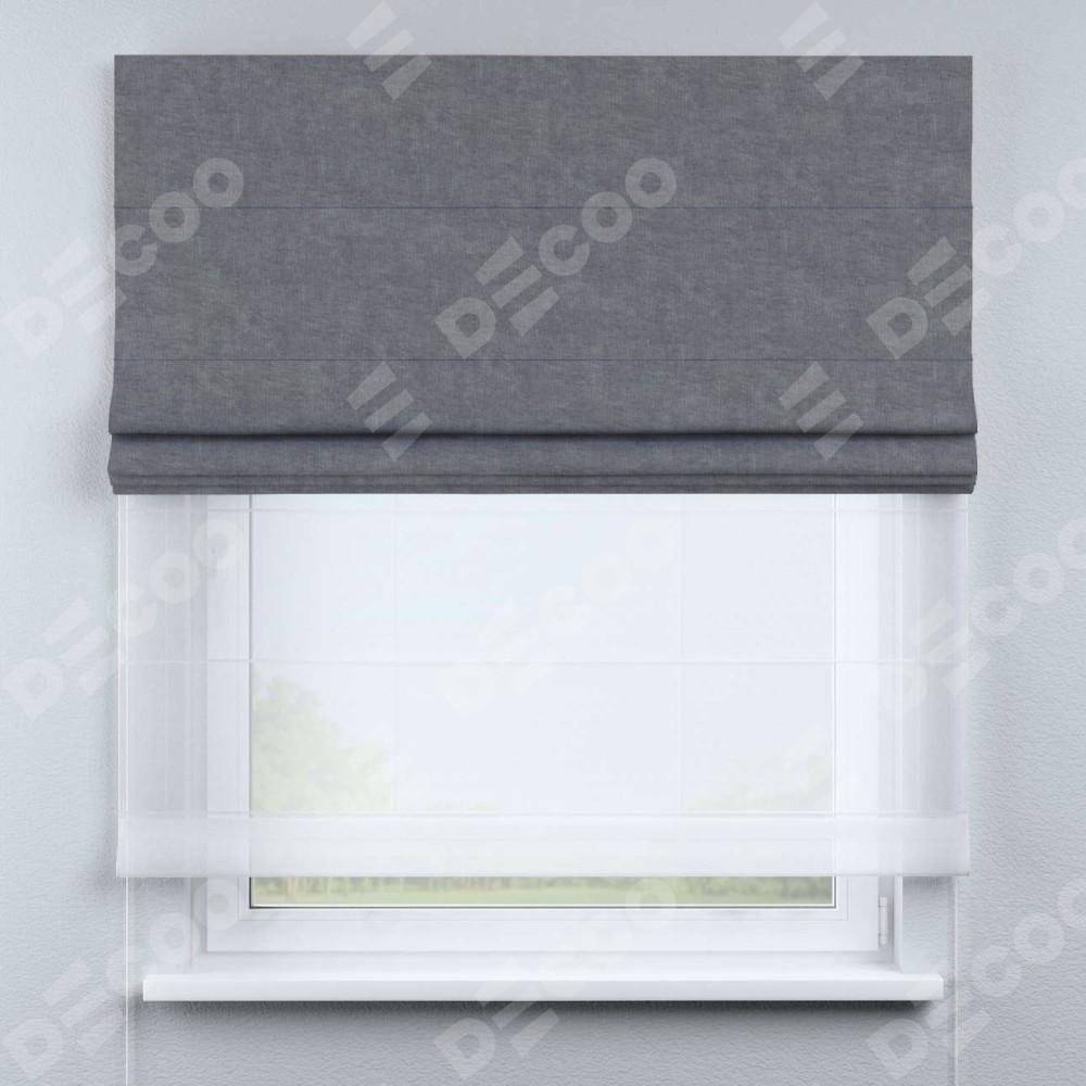 Римская штора день-ночь производителя «Cortin», используется для проёма, пошита из двух полотен, с лицевой стороны канвас стальной артикул v-1082, вторая ткань тюль (по стандарту комплектуется тюль белого цвета артикул V-01). Имеет универсальный механизм и подходит для монтажа: на потолок, на стену и в нишу.
