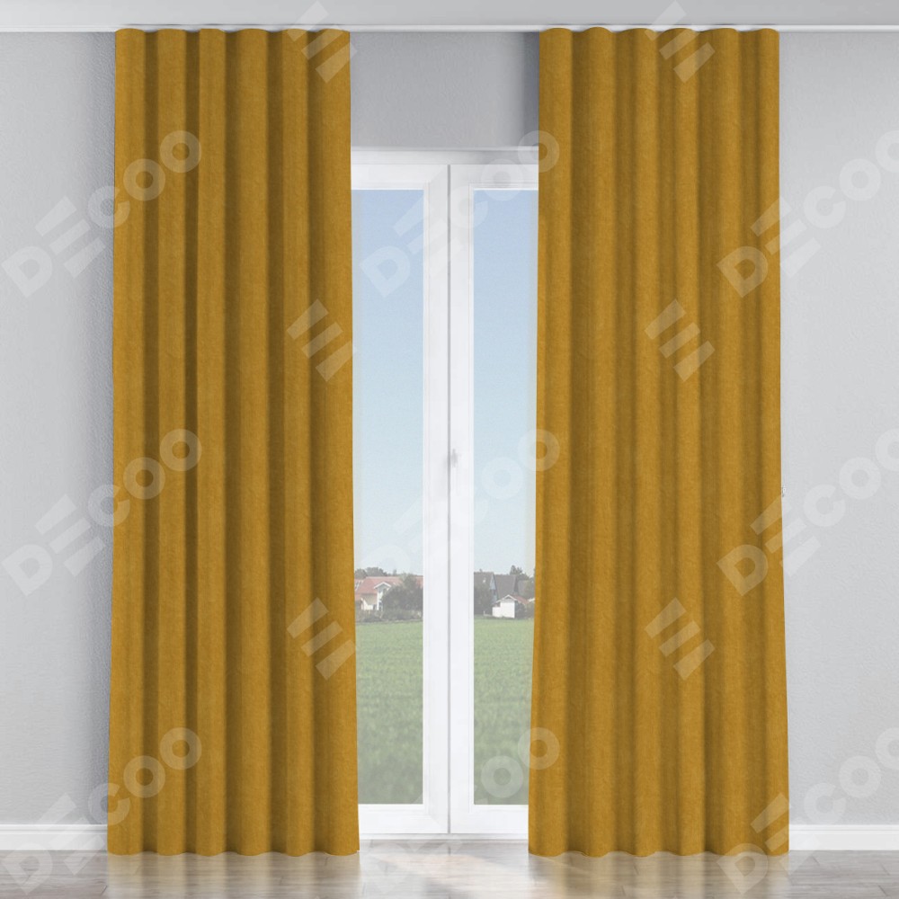 Комплект прямых штор, от производителя «Cortin», пошиты из ткани канвас горчица, артикул ткани v-476. С изнаночной стороны в верхней части штор пристрачивается шторная лента с декоративными складками «Волна». Для создания элегантных складок прямые шторы шьются по стандарту с коэффициентом 1:2 (на 100 см. ширины проёма 200 см. ширины ткани).