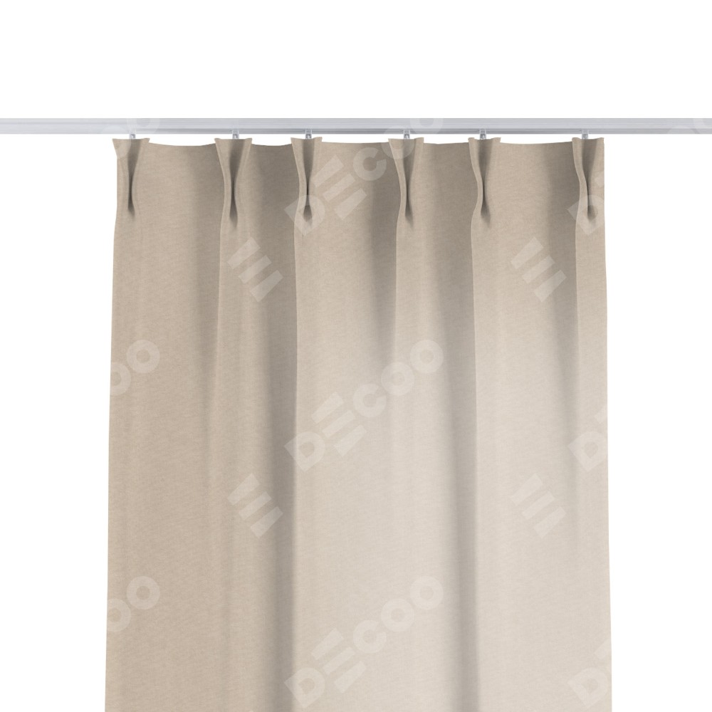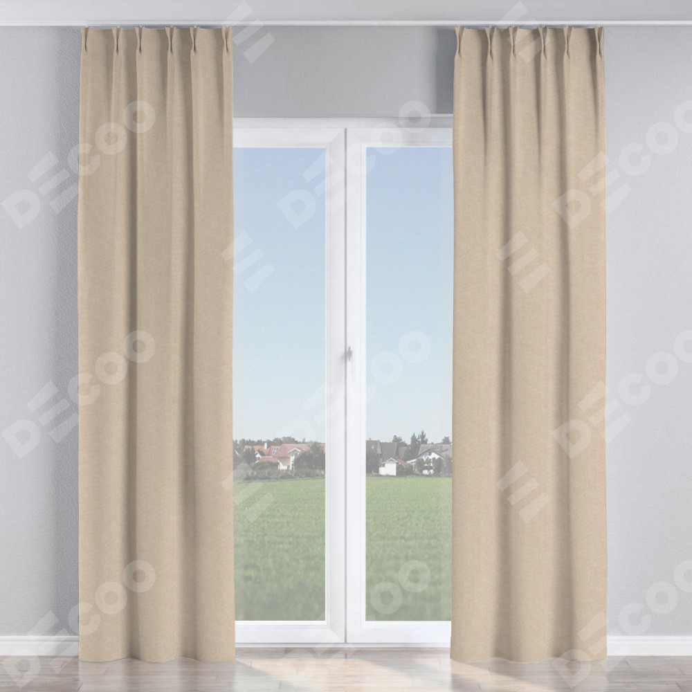 Комплект прямых штор, от производителя «Cortin», пошиты из ткани канвас кофе с молоком, артикул ткани v-07. С изнаночной стороны в верхней части штор пристрачивается шторная лента с декоративными складками «Кустик». Для создания элегантных складок прямые шторы шьются по стандарту с коэффициентом 1:2 (на 100 см. ширины проёма 200 см. ширины ткани).