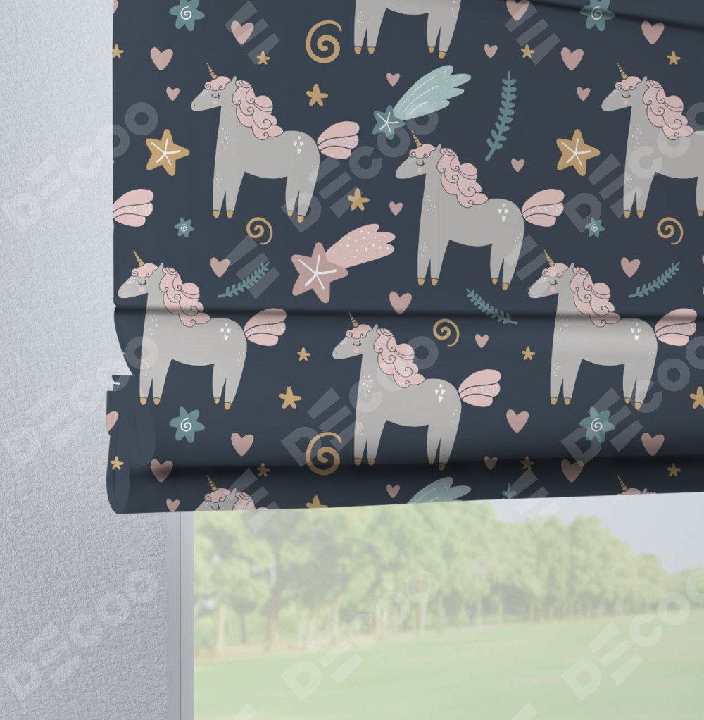 Римская штора производителя «Cortin», используется для проёма, пошита из ткани блэкаут с нанесением сублимационной печати «Милые единороги». Данная модель пошита на петлях, комплектуется на выбор круглым карнизом и подходит для монтажа на стену. Римская штора на петлях имеет простую систему регулировки высоты, отличительным преимуществом данной модели является простой способ монтажа. Достаточно повесить ее на трубу и штора готова!