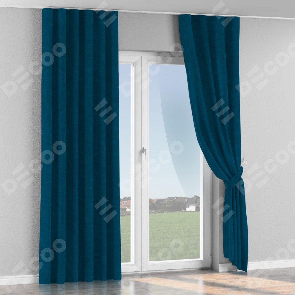 Комплект прямых штор, от производителя «Cortin», пошиты из ткани канвас синий, артикул ткани v-573. С изнаночной стороны в верхней части штор пристрачивается шторная лента с декоративными складками «Волна». Для создания элегантных складок прямые шторы шьются по стандарту с коэффициентом 1:2 (на 100 см. ширины проёма 200 см. ширины ткани).