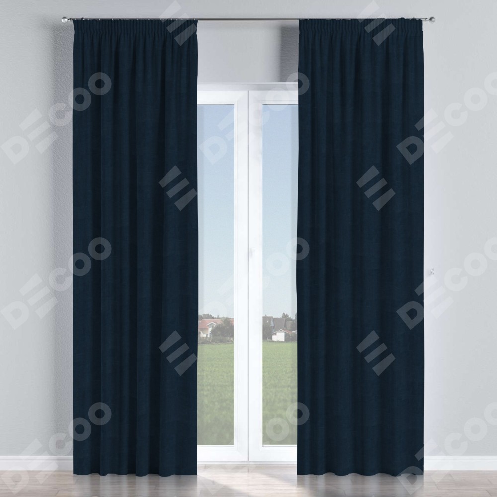 Комплект прямых штор, от производителя «Cortin», пошиты из ткани канвас тёмно-синий, артикул ткани v-206. С изнаночной стороны в верхней части штор пристрачивается шторная лента с декоративными складками «Карандаш». Для создания элегантных складок прямые шторы шьются по стандарту с коэффициентом 1:2 (на 100 см. ширины проёма 200 см. ширины ткани).