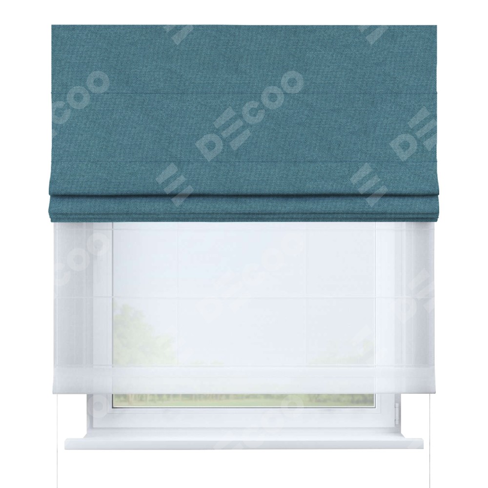 Двойная римская штора «День-ночь» от производителя Cortin предназначена для использования в проёмах. Эта штора уникальна тем, что состоит из двух полотен. На лицевой стороне находится лён димаут светло-синий (артикул: 91007), обеспечивающий эффективное затемнение. В комплект также входит вторая ткань — легкий белый тюль (артикул: V-01), который добавляет изящества и легкости оформлению окна. Кроме того, доступны и другие разновидности ткани тюль, выбор которых доступен по  ссылке .