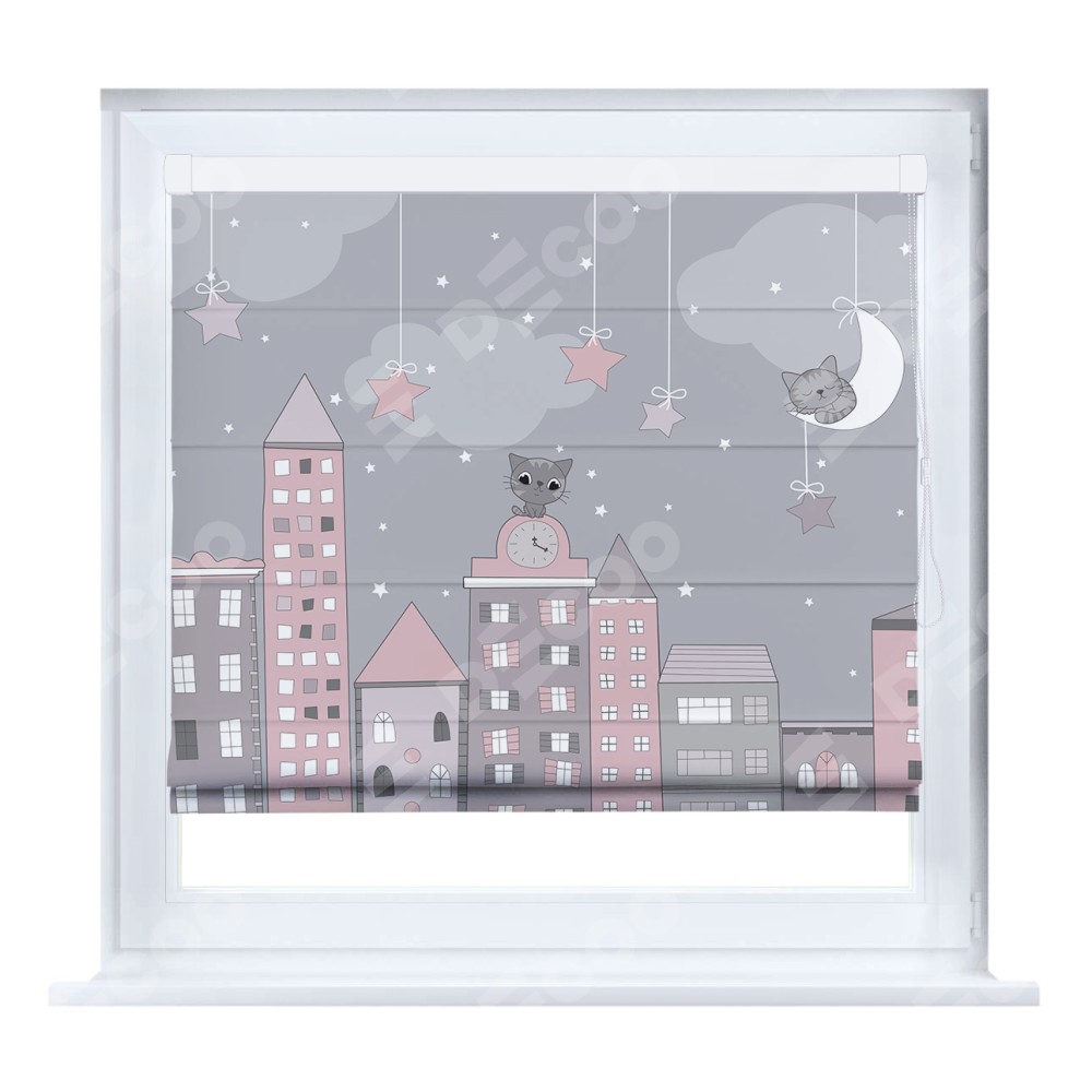 Римская штора кассетного типа, производителя «Cortin», устанавливается только на пластиковые окна и прилегает к стеклопакету, пошита из ткани блэкаут с нанесением сублимационной печати «Вечерний город».