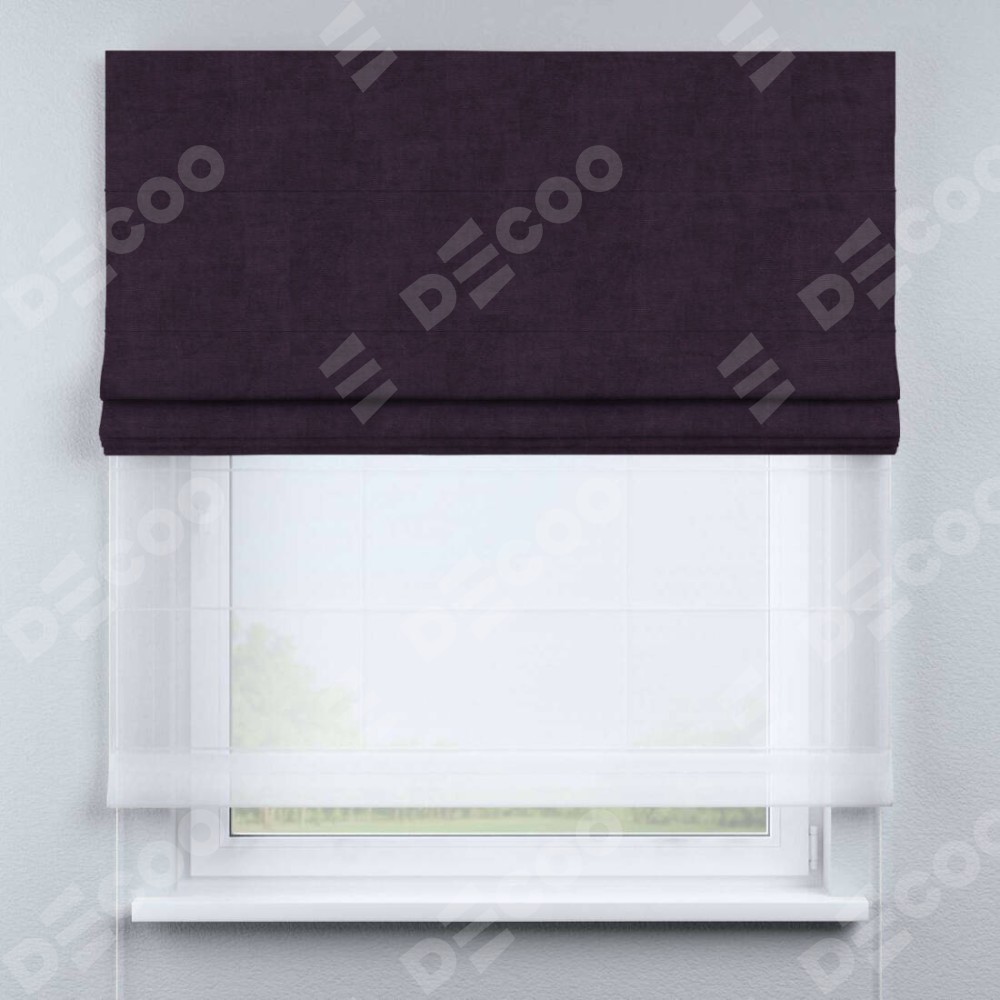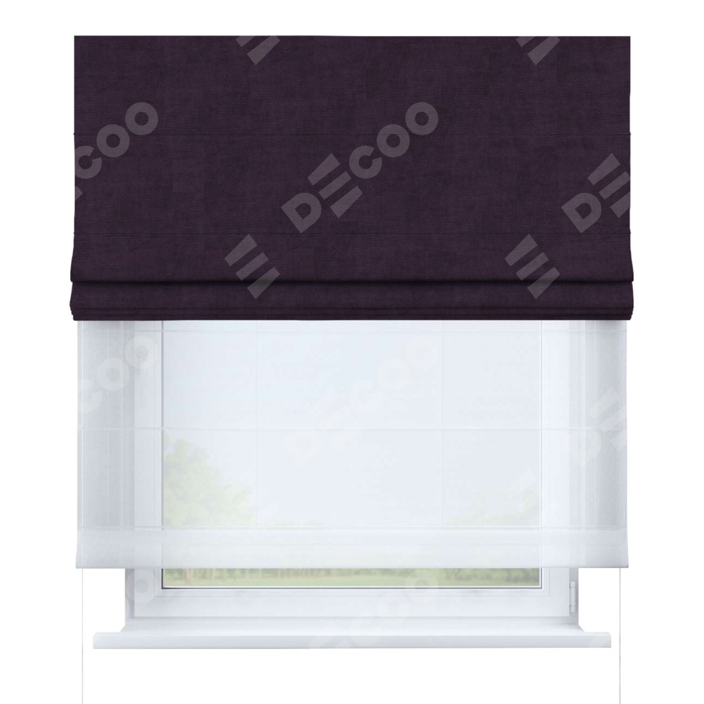 Двойная римская штора «День-ночь» от производителя Cortin предназначена для использования в проёмах. Эта штора уникальна тем, что состоит из двух полотен. На лицевой стороне находится вельвет тёмно-фиолетовый (артикул: 72403), обеспечивающий мягкое затемнение. В комплект также входит вторая ткань — легкий белый тюль (артикул: V-01), который добавляет изящества и легкости оформлению окна. Кроме того, доступны и другие разновидности ткани тюль, выбор которых доступен по  ссылке .