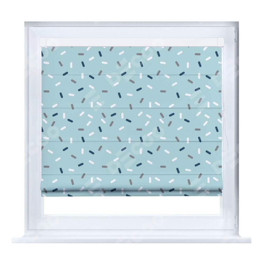 Римская штора кассетного типа, производителя «Cortin», устанавливается только на пластиковые окна и прилегает к стеклопакету, пошита из ткани блэкаут с нанесением сублимационной печати «Короткие линии».
