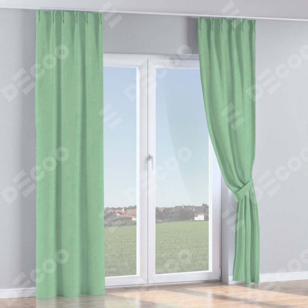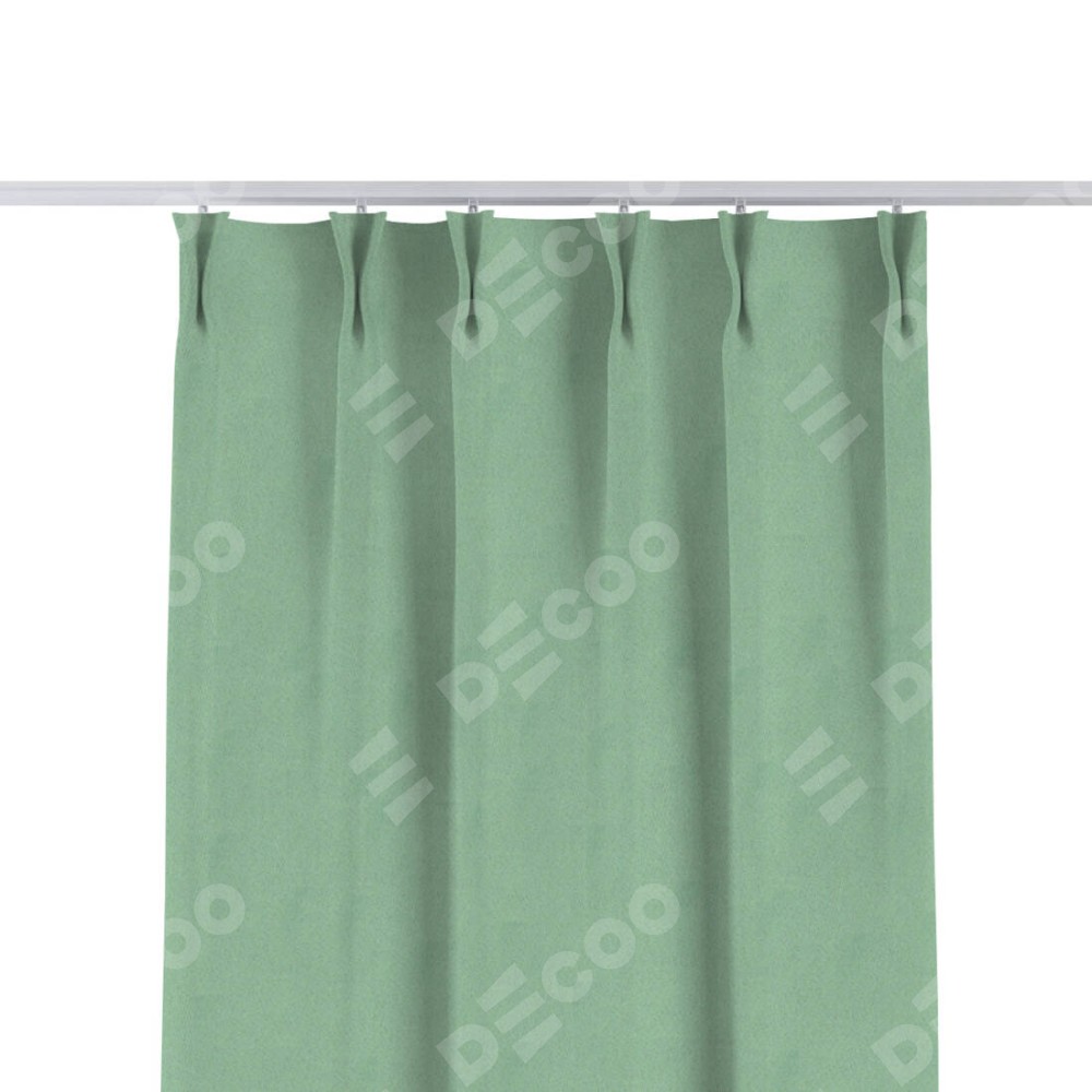Комплект прямых штор, от производителя «Cortin», пошиты из ткани блэкаут однотонный ментоловый, артикул ткани 91572−1. С изнаночной стороны в верхней части штор пристрачивается шторная лента с декоративными складками «Кустик». Для создания элегантных складок прямые шторы шьются по стандарту с коэффициентом 1:2 (на 100 см. ширины проёма 200 см. ширины ткани).