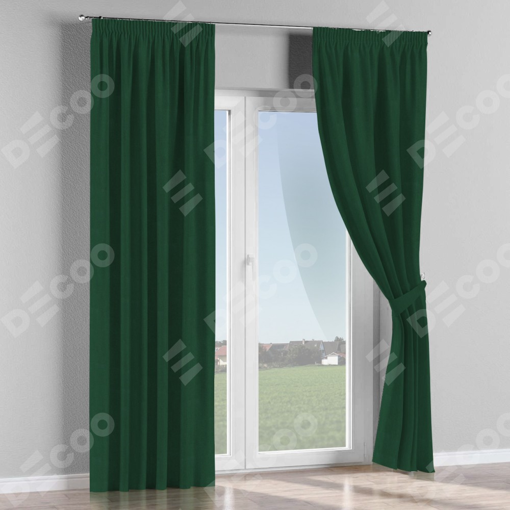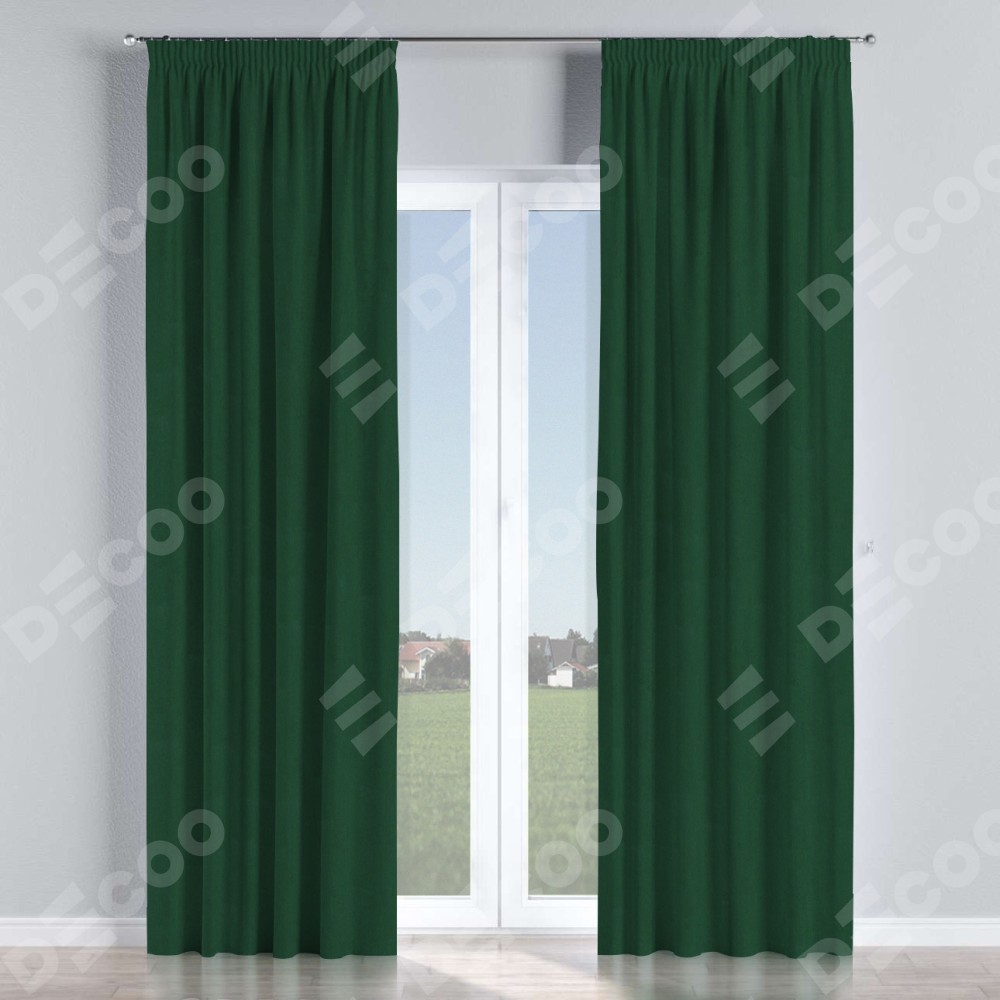 Комплект прямых штор, от производителя «Cortin», пошиты из ткани блэкаут однотонный зелёный, артикул ткани 91572−2. С изнаночной стороны в верхней части штор пристрачивается шторная лента с декоративными складками «Карандаш». Для создания элегантных складок прямые шторы шьются по стандарту с коэффициентом 1:2 (на 100 см. ширины проёма 200 см. ширины ткани).