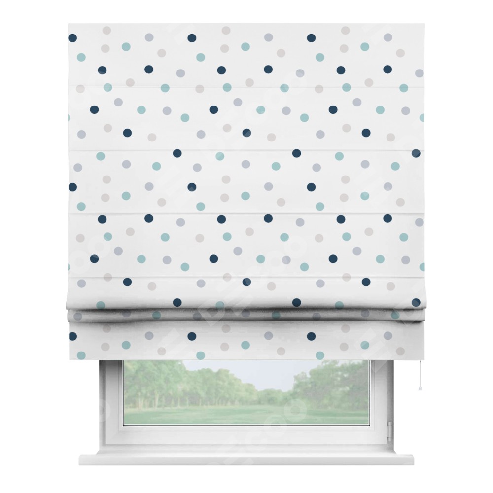 Римская штора производителя «Cortin», используется для проёма, пошита из ткани блэкаут с нанесением сублимационной печати «Точки». Имеет универсальный механизм и подходит для монтажа: на потолок, на стену и в нишу.