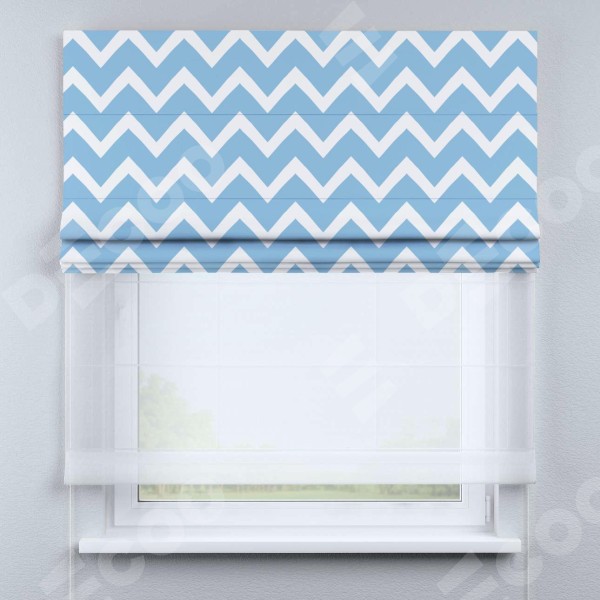 Римская штора день-ночь производителя «Cortin», используется для проёма, пошита из двух полотен, с лицевой блэкаут с нанесением сублимационной печати «Зигзаг средний», вторая ткань тюль (по стандарту комплектуется тюль белого цвета артикул V-01). Имеет универсальный механизм и подходит для монтажа: на потолок, на стену и в нишу.