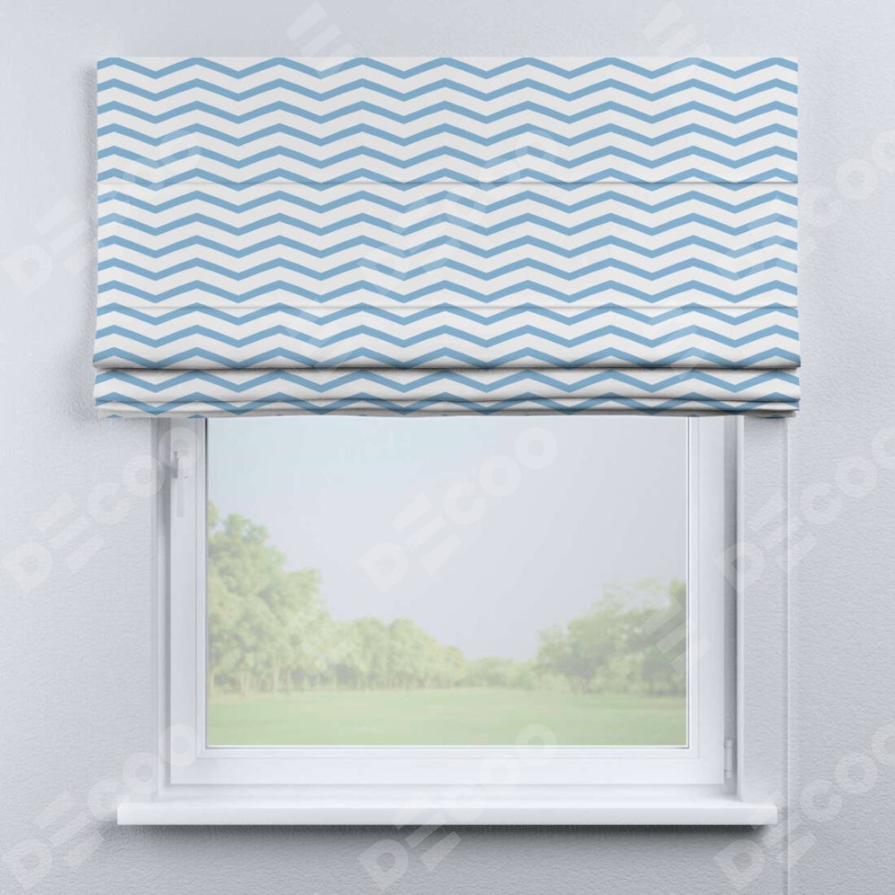 Римская штора производителя «Cortin», используется для проёма, пошита из ткани блэкаут с нанесением сублимационной печати «Зигзаг мелкий». Имеет универсальный механизм и подходит для монтажа: на потолок, на стену и в нишу.