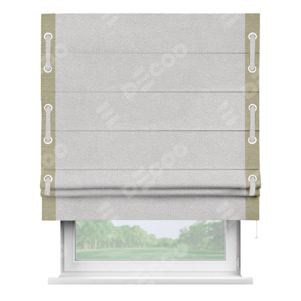 Римская штора производителя «Cortin», используется для проёма, пошита из ткани лён димаут светло-бежевый, артикул 90993. Отделка шторы кантом «Стрим Дуо» на кантах расположены люверсы с пояском, ткань для канта используется лён димаут разной расцветки на выбор. Ткань для пояска обычно используется из основной ткани шторы, а так же можно сделать из любой расцветки по желанию. Имеет универсальный механизм и подходит для монтажа: на потолок, на стену и в нишу.
