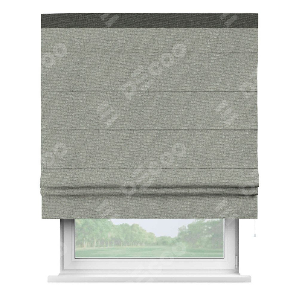 Римская штора производителя «Cortin», используется для проёма, пошита из ткани лён димаут серый, артикул 91009. Отделка шторы кантом «Кинг», ткань для канта используется из льна димаут разной расцветки на выбор. Имеет универсальный механизм и подходит для монтажа: на потолок, на стену и в нишу.