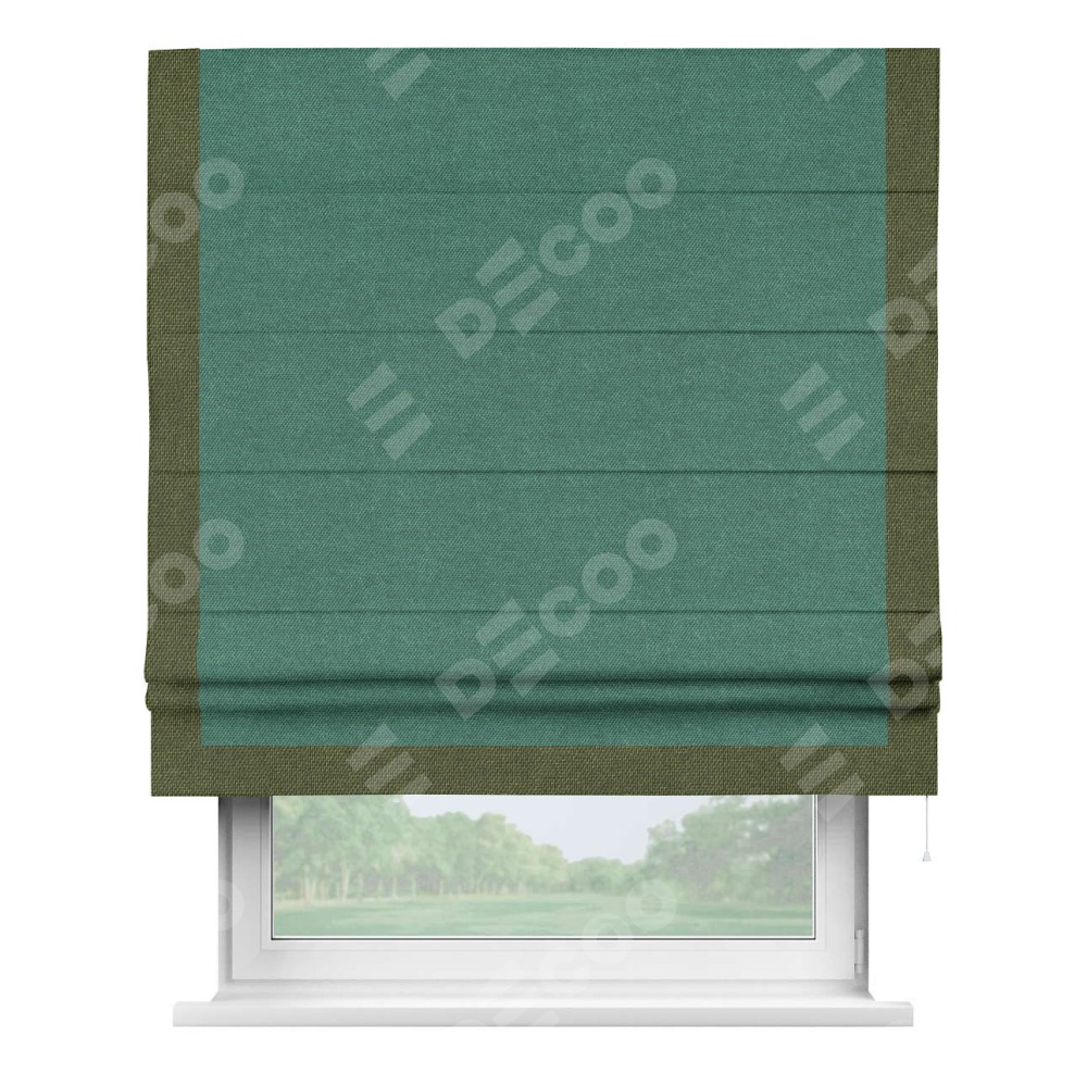Римская штора производителя «Cortin», используется для проёма, пошита из ткани лён димаут светло-бирюзовый, артикул 91005. Отделка шторы кантом «Виктория», ткань для канта используется из льна димаут разной расцветки на выбор. Имеет универсальный механизм и подходит для монтажа: на потолок, на стену и в нишу.