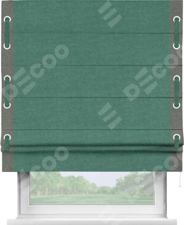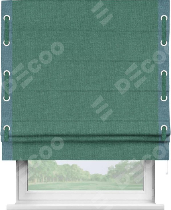 Римская штора производителя «Cortin», используется для проёма, пошита из ткани лён димаут светло-бирюзовый, артикул 91005. Отделка шторы кантом «Стрим Дуо» на кантах расположены люверсы с пояском, ткань для канта используется лён димаут разной расцветки на выбор. Ткань для пояска обычно используется из основной ткани шторы, а так же можно сделать из любой расцветки по желанию. Имеет универсальный механизм и подходит для монтажа: на потолок, на стену и в нишу.