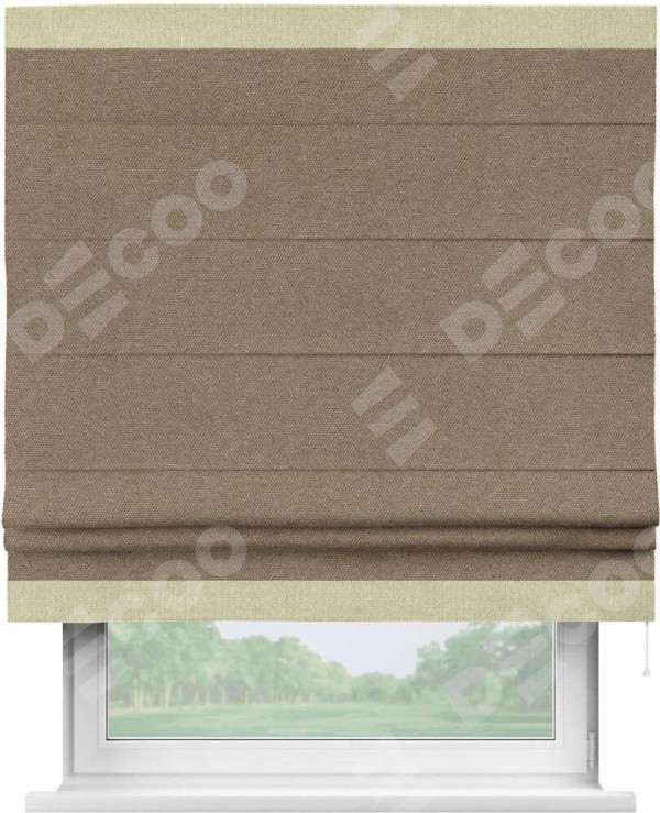 Римская штора производителя «Cortin», используется для проёма, пошита из ткани лён димаут коричневый, артикул 90996. Отделка шторы кантом «Горизонт», ткань для канта используется из льна димаут разной расцветки на выбор. Имеет универсальный механизм и подходит для монтажа: на потолок, на стену и в нишу.