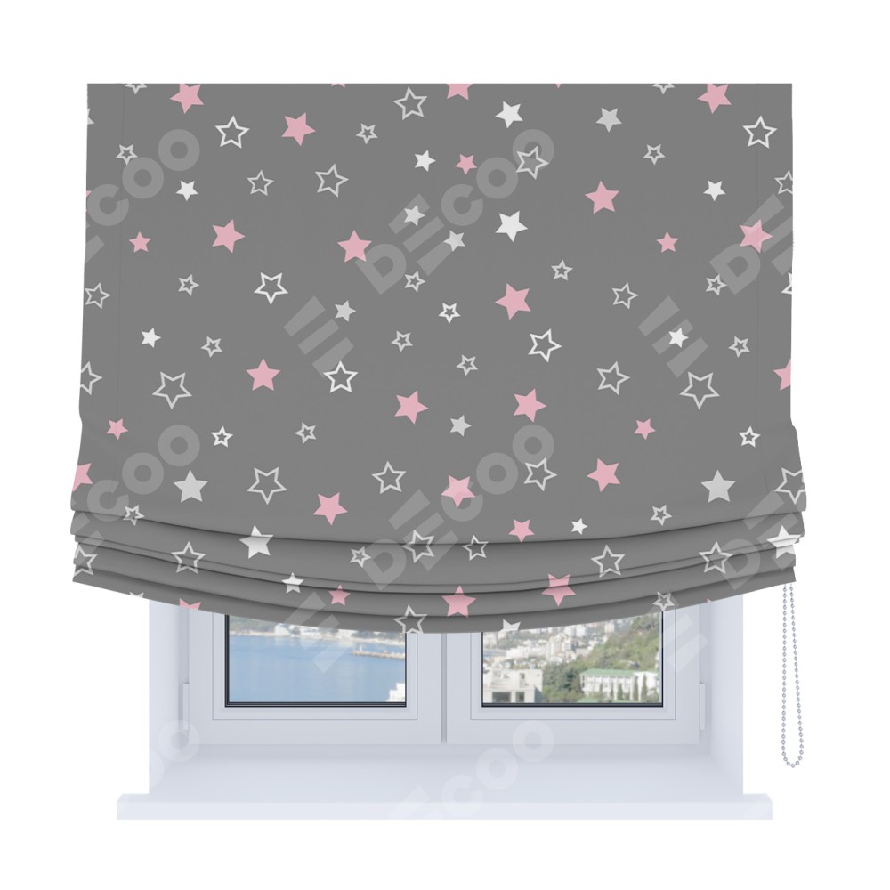 Римская штора Soft производителя «Cortin», используется для проёма, пошита из ткани блэкаут с нанесением сублимационной печати «Розовый звездопад». Имеет универсальный механизм и подходит для монтажа: на потолок, на стену и в нишу. В отличие от стандартных римских штор, римская штора Soft не имеет горизонтальных вставок и нижнего отвеса. Это позволяет ткани произвольно драпироваться в свободные мягкие складки.