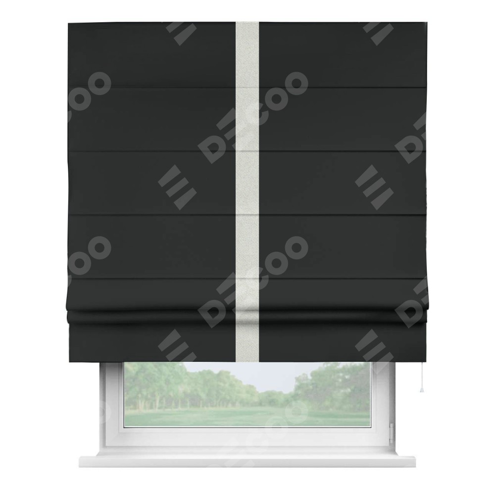 Римская штора производителя «Cortin», используется для проёма, пошита из ткани блэкаут однотонный черный, артикул ткани 91571−2. Отделка шторы кантом «Хайвей», ткань для канта используется из блэкаута однотонного разной расцветки на выбор. Имеет универсальный механизм и подходит для монтажа: на потолок, на стену и в нишу.