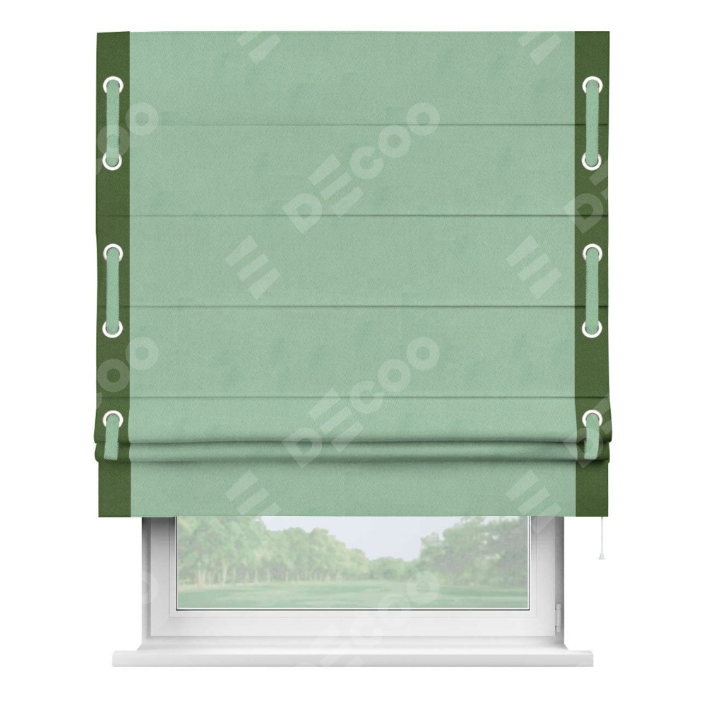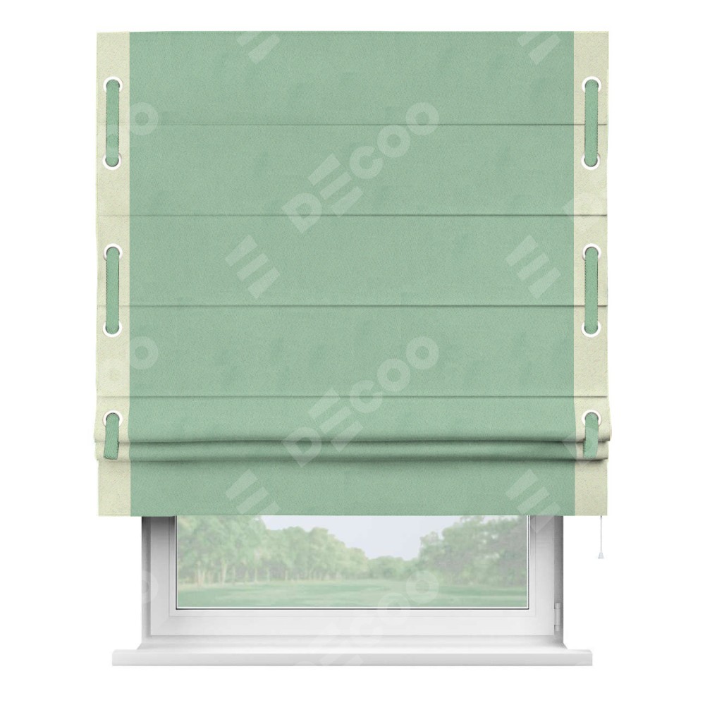 Римская штора производителя «Cortin», используется для проёма, пошита из ткани блэкаут однотонный ментоловый, артикул ткани 91572−1. Отделка шторы кантом «Стрим Дуо» на кантах расположены люверсы с пояском, ткань для канта используется из блэкаута однотонного разной расцветки на выбор. Ткань для пояска обычно используется из основной ткани шторы, а так же можно сделать из любой расцветки по желанию. Имеет универсальный механизм и подходит для монтажа: на потолок, на стену и в нишу.