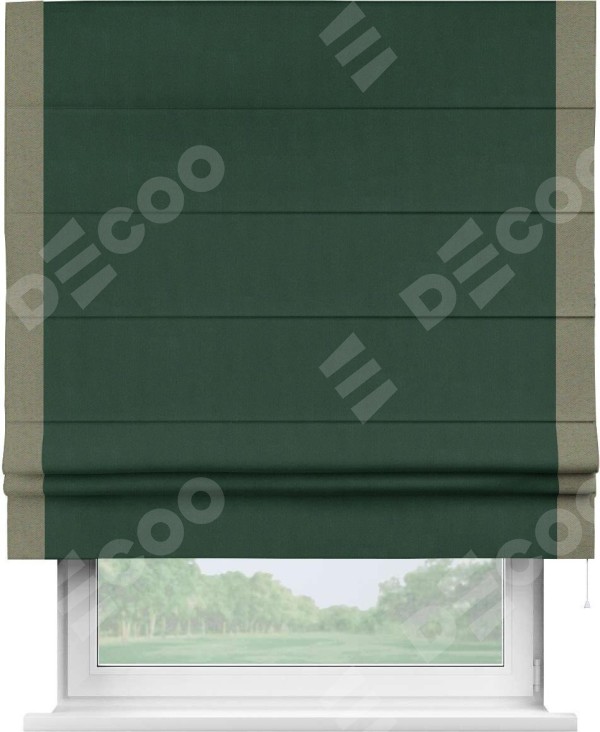 Римская штора производителя «Cortin», используется для проёма, пошита из ткани блэкаут однотонный зелёный, артикул ткани 91572−2. Отделка шторы кантом «Стрим Дуо», ткань для канта используется из блэкаута однотонного разной расцветки на выбор. Имеет универсальный механизм и подходит для монтажа: на потолок, на стену и в нишу.