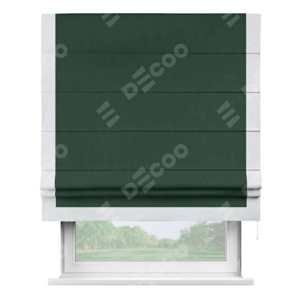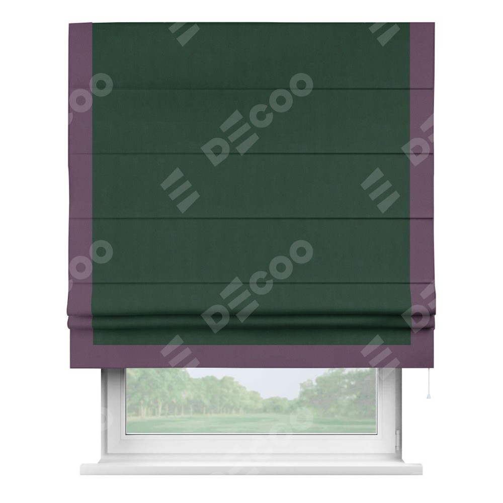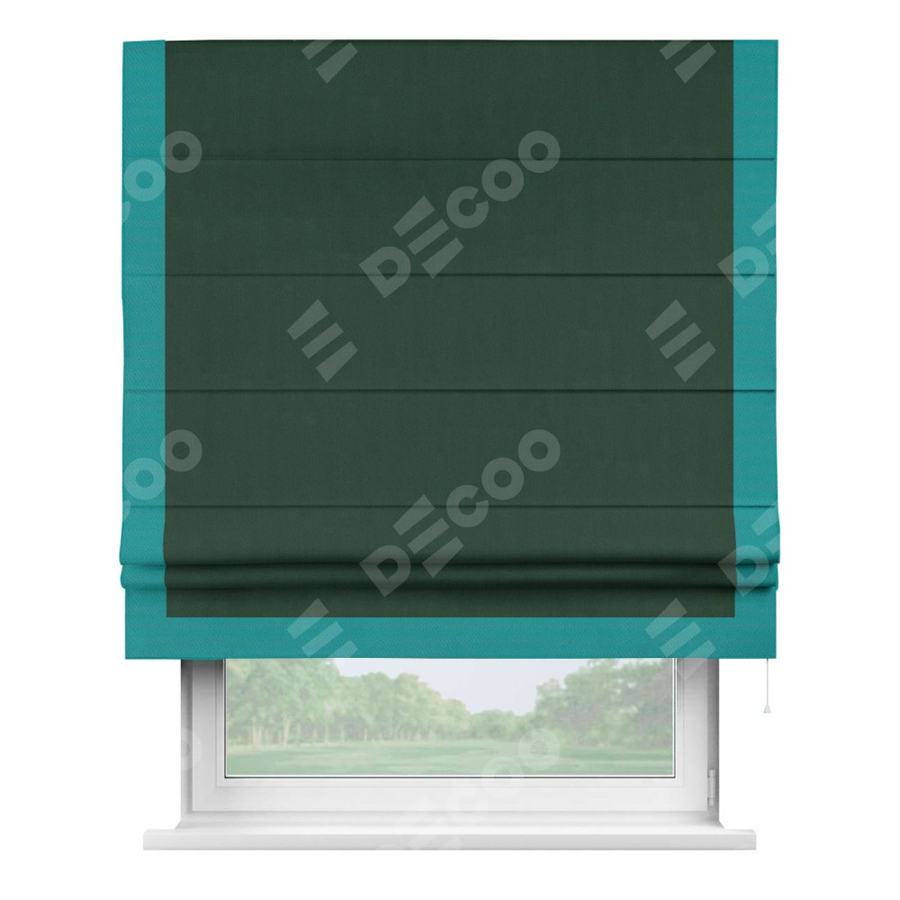 Римская штора производителя «Cortin», используется для проёма, пошита из ткани блэкаут однотонный зелёный, артикул ткани 91572−2. Отделка шторы кантом «Виктория», ткань для канта используется из блэкаута однотонного разной расцветки на выбор. Имеет универсальный механизм и подходит для монтажа: на потолок, на стену и в нишу.