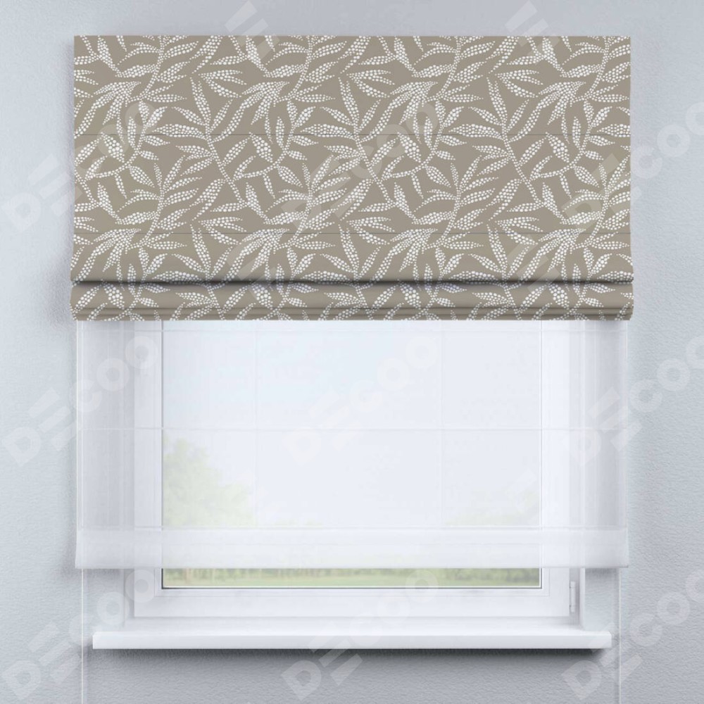 Двойная римская штора «День-ночь» от производителя Cortin предназначена для использования в проёмах. Эта штора уникальна тем, что состоит из двух полотен. На лицевой стороне находится блэкаут с нанесением сублимационной печати «Бежевая иллюзия», обеспечивающий эффективное затемнение. В комплект также входит вторая ткань — легкий белый тюль (артикул: V-01), который добавляет изящества и легкости оформлению окна. Кроме того, доступны и другие разновидности ткани тюль, выбор которых доступен по ссылке .