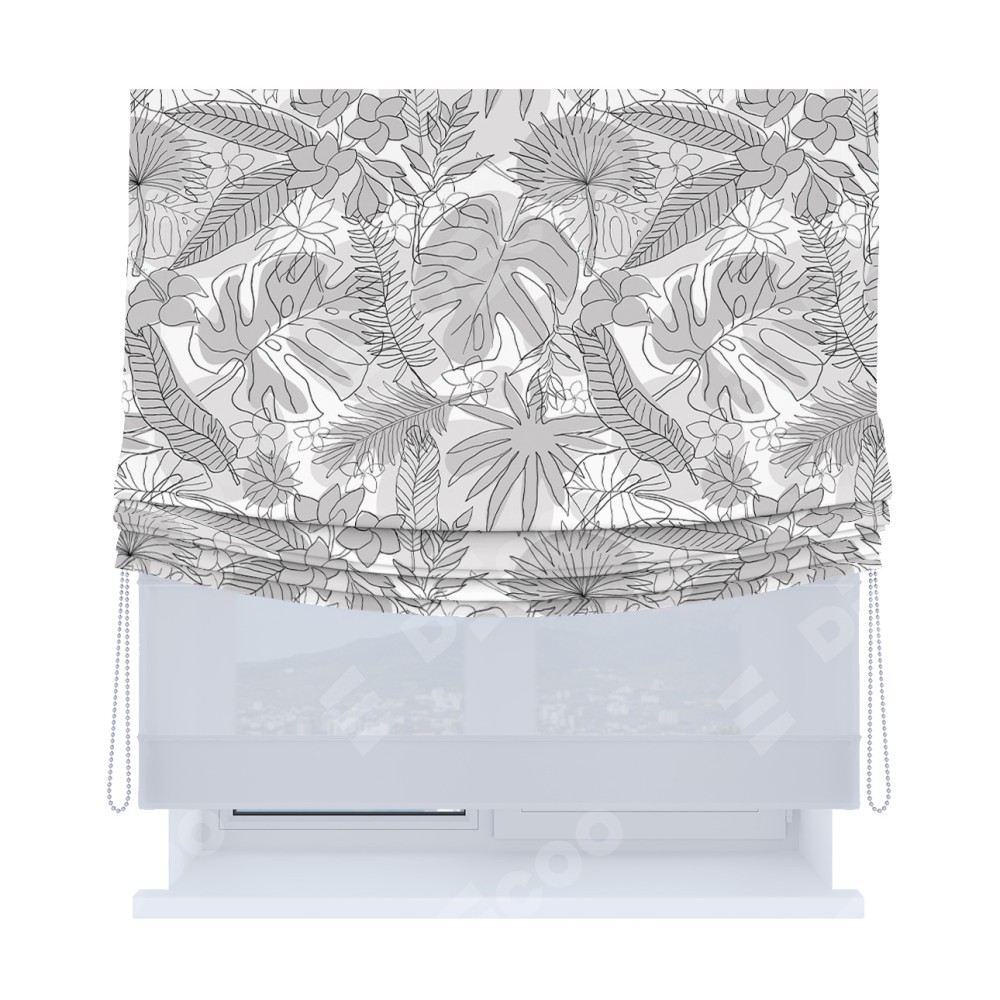Римская штора день-ночь производителя «Cortin», используется для проёма, пошита из двух полотен, с лицевой блэкаут с нанесением сублимационной печати «Тропический лес», вторая ткань тюль (по стандарту комплектуется тюль белого цвета артикул V-01). Имеет универсальный механизм и подходит для монтажа: на потолок, на стену и в нишу. Удобное управление каждой шторой отдельно.