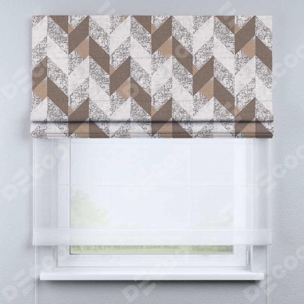 Двойная римская штора «День-ночь» от производителя Cortin предназначена для использования в проёмах. Эта штора уникальна тем, что состоит из двух полотен. На лицевой стороне находится блэкаут с нанесением сублимационной печати «Шеврон Либерти», обеспечивающий эффективное затемнение. В комплект также входит вторая ткань — легкий белый тюль (артикул: V-01), который добавляет изящества и легкости оформлению окна. Кроме того, доступны и другие разновидности ткани тюль, выбор которых доступен по ссылке .