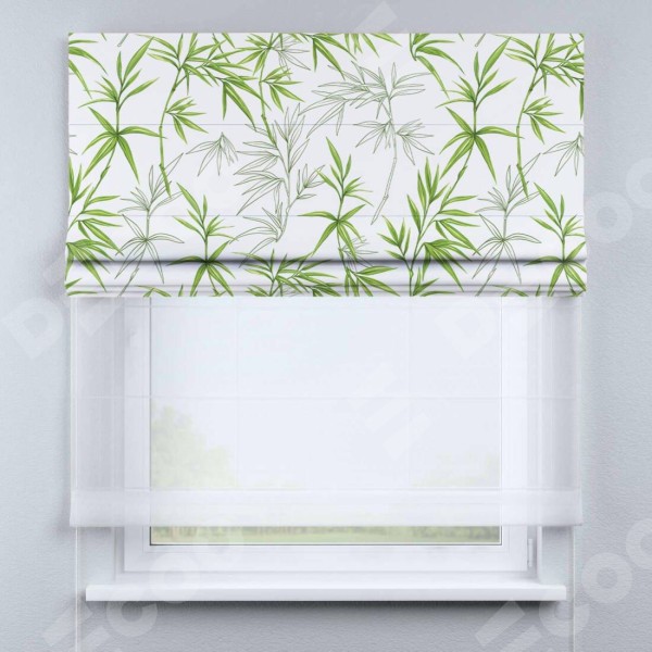 Двойная римская штора «День-ночь» от производителя Cortin предназначена для использования в проёмах. Эта штора уникальна тем, что состоит из двух полотен. На лицевой стороне находится блэкаут с нанесением сублимационной печати «Зелёный бамбук», обеспечивающий эффективное затемнение. В комплект также входит вторая ткань — легкий белый тюль (артикул: V-01), который добавляет изящества и легкости оформлению окна. Кроме того, доступны и другие разновидности ткани тюль, выбор которых доступен по  ссылке .