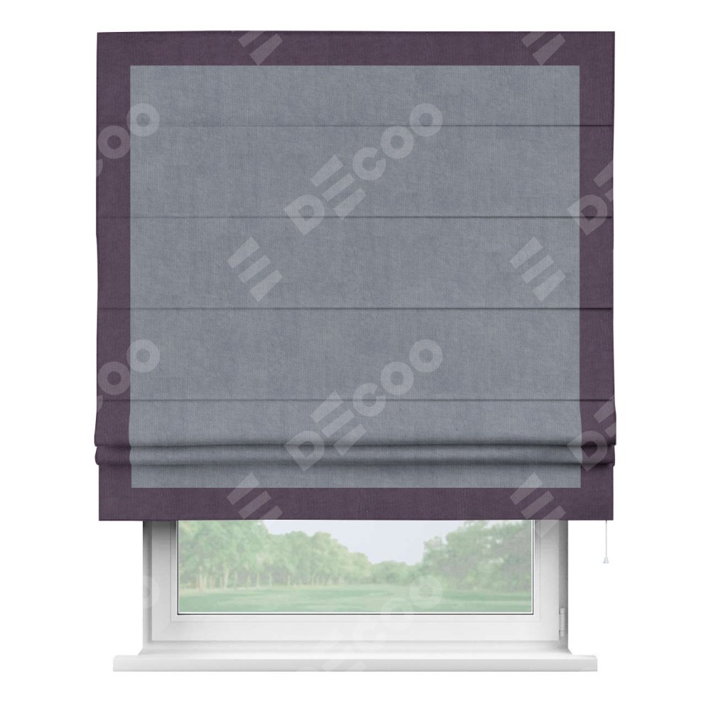 Римская штора производителя «Cortin», используется для проёма, пошита из ткани канвас васильковый, артикул ткани v-203. Отделка шторы кантом «Чесс» (баклажановый v-111), ткань для канта используется из канваса разной расцветки на выбор. Имеет универсальный механизм и подходит для монтажа: на потолок, на стену и в нишу.