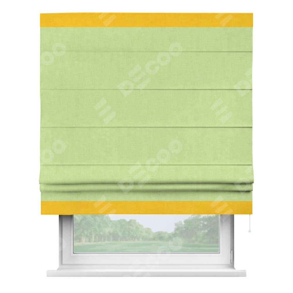 Римская штора производителя «Cortin», используется для проёма, пошита из ткани канвас липовый, артикул ткани v-207. Отделка шторы кантом «Горизонт» (желтый v-344), ткань для канта используется из канваса разной расцветки на выбор. Имеет универсальный механизм и подходит для монтажа: на потолок, на стену и в нишу.