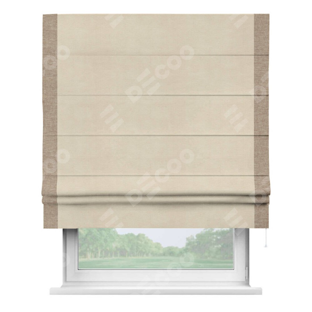 Римская штора производителя «Cortin», используется для проёма, пошита из ткани лён кашемир шампань, артикул 17205. Отделка шторы кантом «Стрим Дуо», ткань для канта используется из льна разной расцветки на выбор. Имеет универсальный механизм и подходит для монтажа: на потолок, на стену и в нишу.