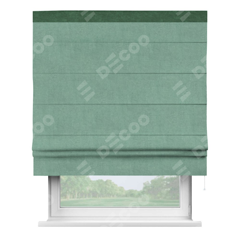 Римская штора производителя «Cortin», используется для проёма, пошита из ткани канвас мятный, артикул ткани v-248. Отделка шторы кантом «Кинг» (тёмно-зелёный v-469), ткань для канта используется из канваса разной расцветки на выбор. Имеет универсальный механизм и подходит для монтажа: на потолок, на стену и в нишу.