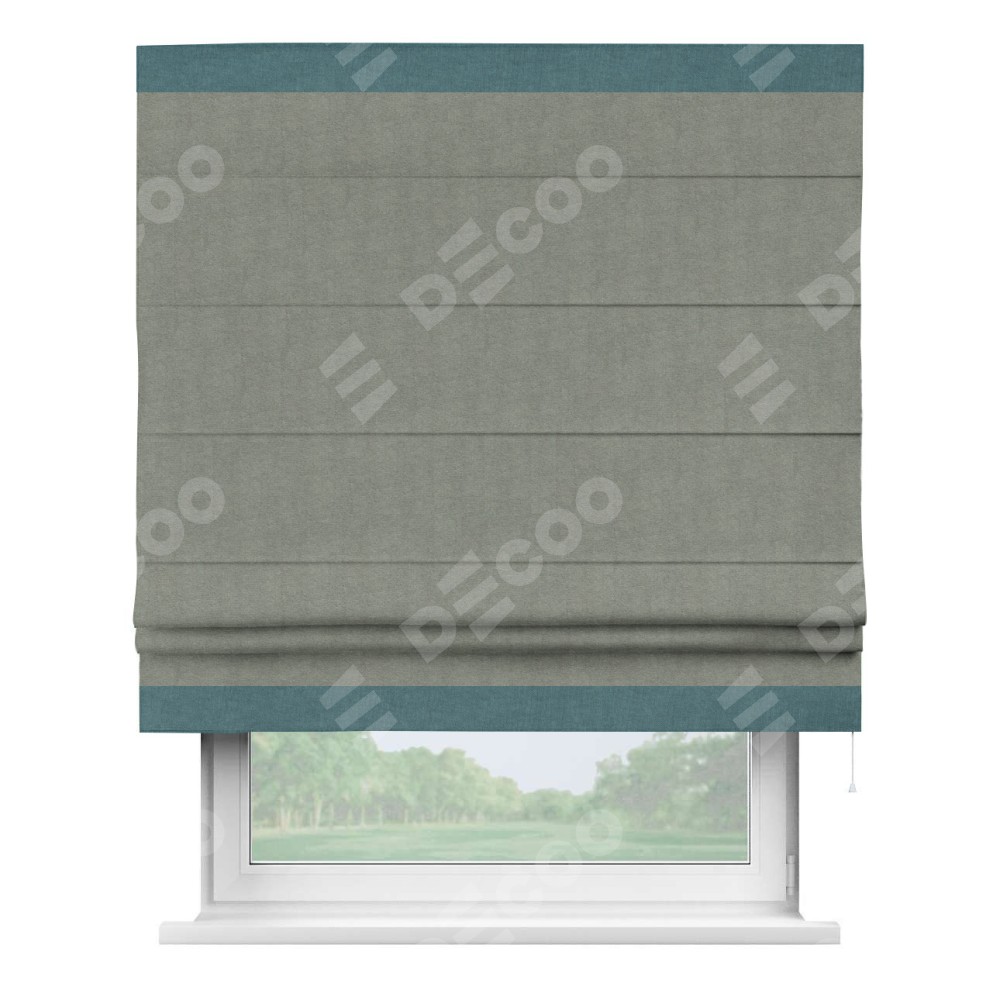 Римская штора производителя «Cortin», используется для проёма, пошита из ткани канвас сизый, артикул ткани v-1902. Отделка шторы кантом «Горизонт» (ментоловый v-114), ткань для канта используется из канваса разной расцветки на выбор. Имеет универсальный механизм и подходит для монтажа: на потолок, на стену и в нишу.