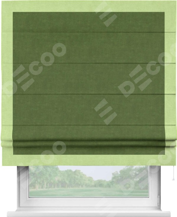 Римская штора производителя «Cortin», используется для проёма, пошита из ткани канвас трава, артикул ткани v-473. Отделка шторы кантом «Чесс» (липовый v-207), ткань для канта используется из канваса разной расцветки на выбор. Имеет универсальный механизм и подходит для монтажа: на потолок, на стену и в нишу.