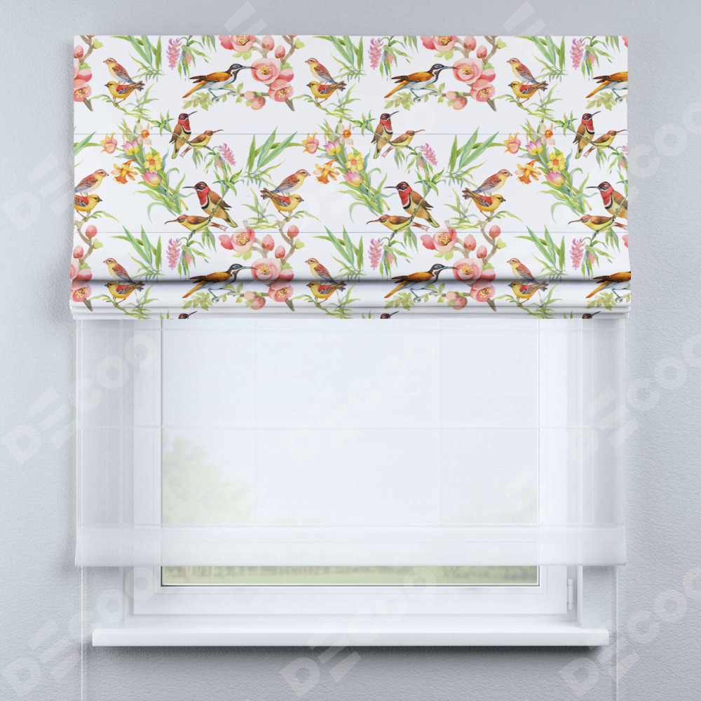 Двойная римская штора «День-ночь» от производителя Cortin предназначена для использования в проёмах. Эта штора уникальна тем, что состоит из двух полотен. На лицевой стороне находится блэкаут с нанесением сублимационной печати «Певчие птички», обеспечивающий эффективное затемнение. В комплект также входит вторая ткань — легкий белый тюль (артикул: V-01), который добавляет изящества и легкости оформлению окна. Кроме того, доступны и другие разновидности ткани тюль, выбор которых доступен по ссылке .