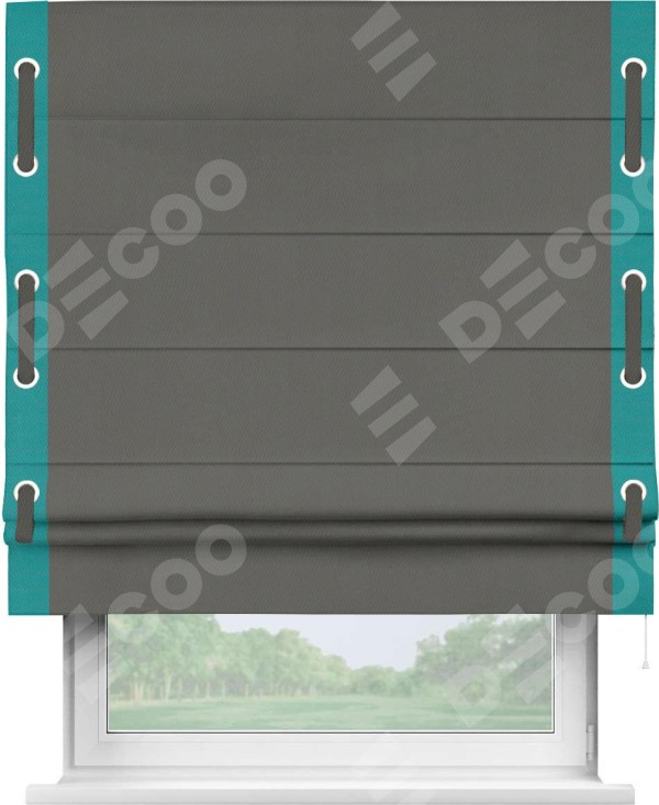 Римская штора производителя «Cortin», используется для проёма, пошита из ткани блэкаут однотонный тёмно-серый, артикул ткани 91570. Отделка шторы кантом «Стрим Дуо» на кантах расположены люверсы с пояском, ткань для канта используется из блэкаута однотонного разной расцветки на выбор. Ткань для пояска обычно используется из основной ткани шторы, а так же можно сделать из любой расцветки по желанию. Имеет универсальный механизм и подходит для монтажа: на потолок, на стену и в нишу.