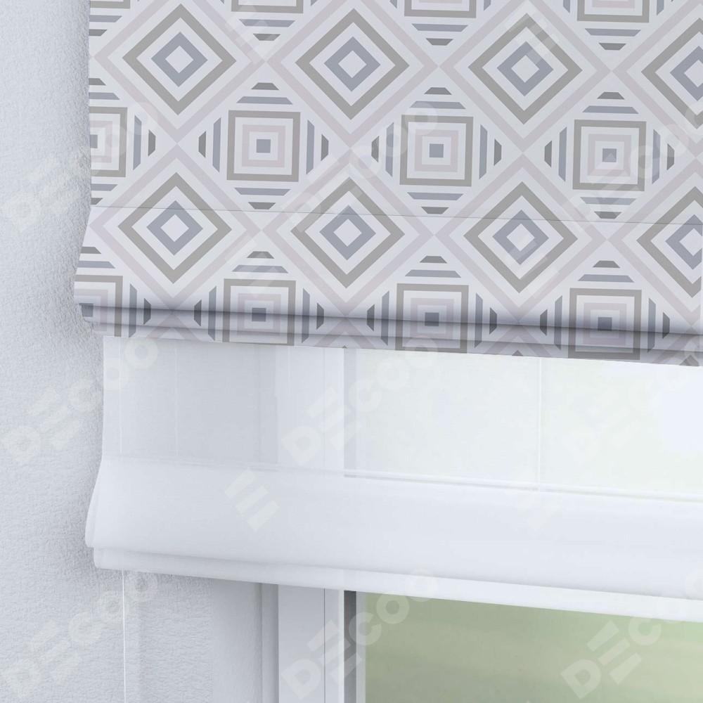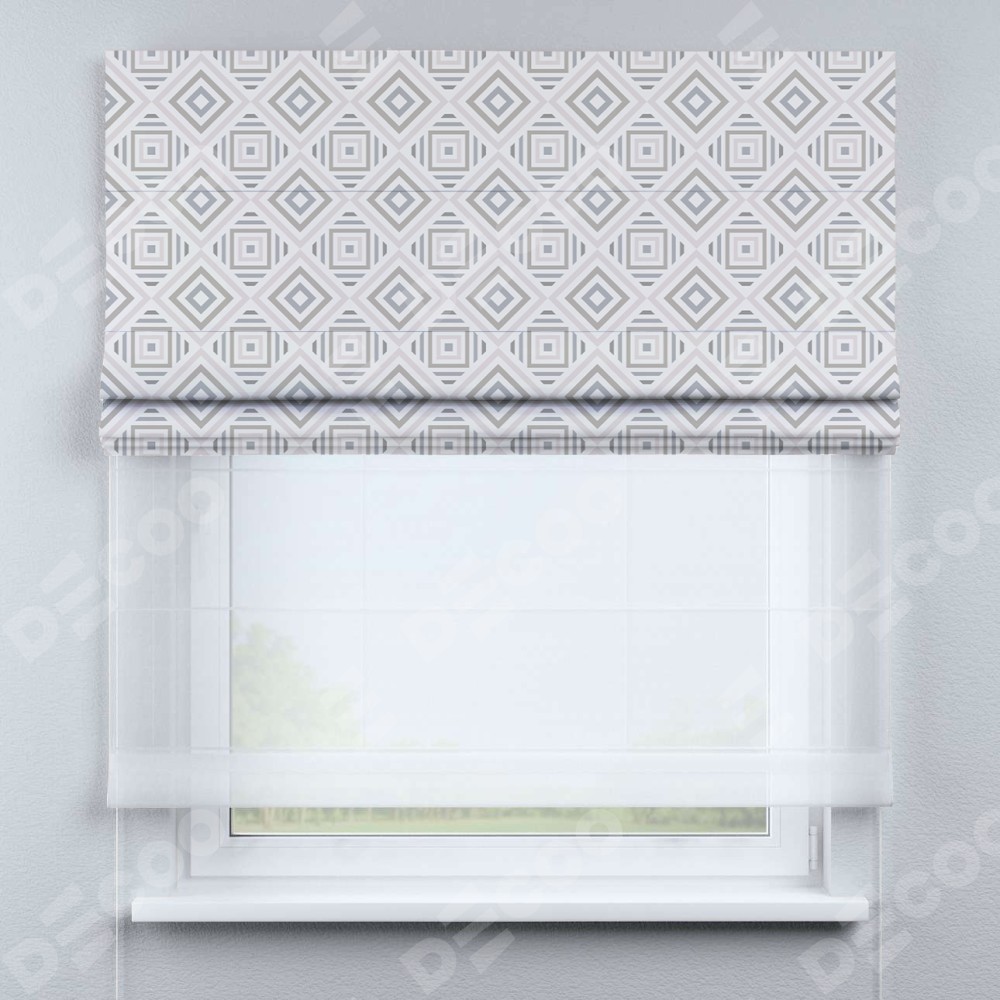 Двойная римская штора «День-ночь» от производителя Cortin предназначена для использования в проёмах. Эта штора уникальна тем, что состоит из двух полотен. На лицевой стороне находится блэкаут с нанесением сублимационной печати «Техно серый», обеспечивающий эффективное затемнение. В комплект также входит вторая ткань — легкий белый тюль (артикул: V-01), который добавляет изящества и легкости оформлению окна. Кроме того, доступны и другие разновидности ткани тюль, выбор которых доступен по  ссылке .
