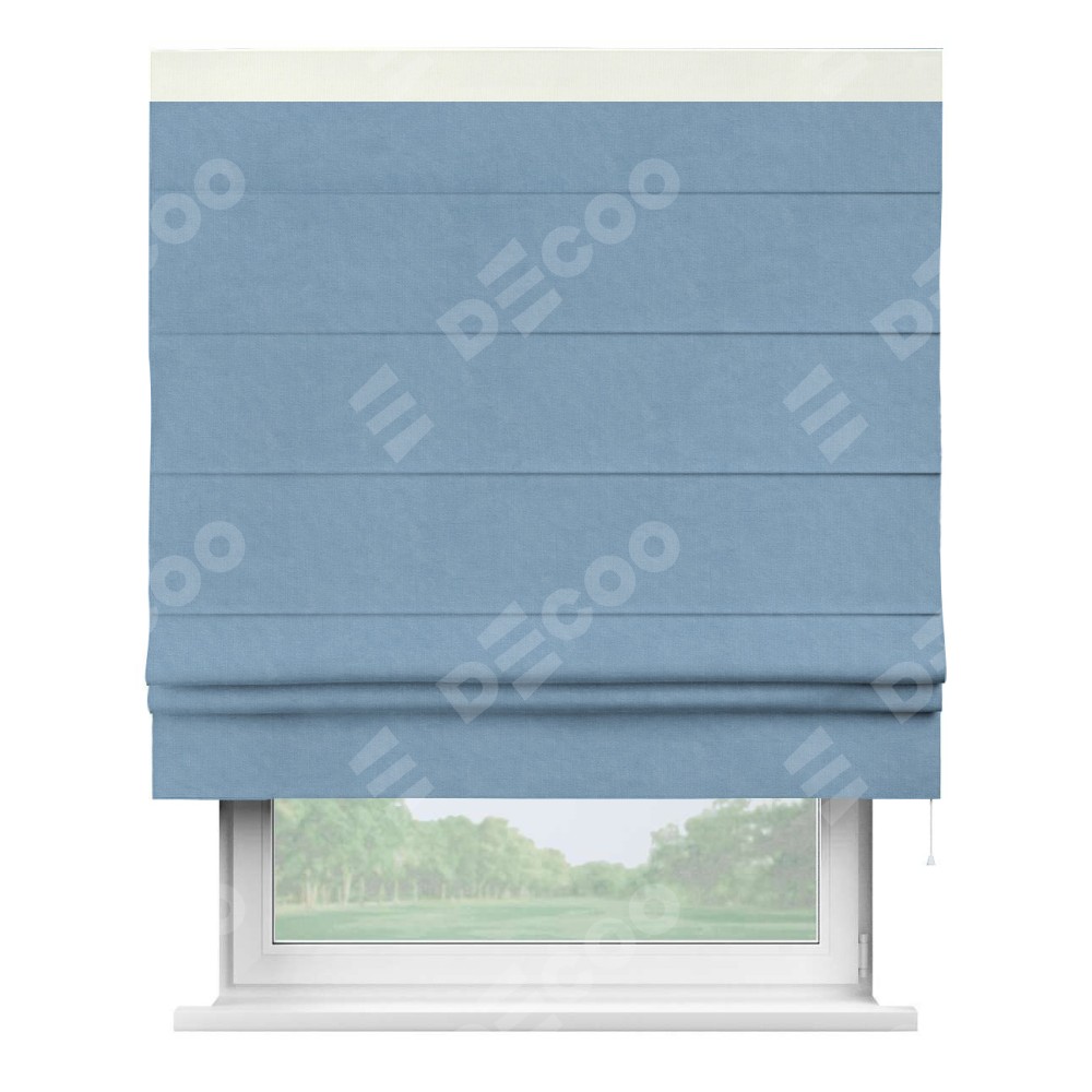 Римская штора производителя «Cortin», используется для проёма, пошита из ткани канвас голубой, артикул ткани 92729. Отделка шторы кантом «Кинг» (молочный v-93), ткань для канта используется из канваса разной расцветки на выбор. Имеет универсальный механизм и подходит для монтажа: на потолок, на стену и в нишу.