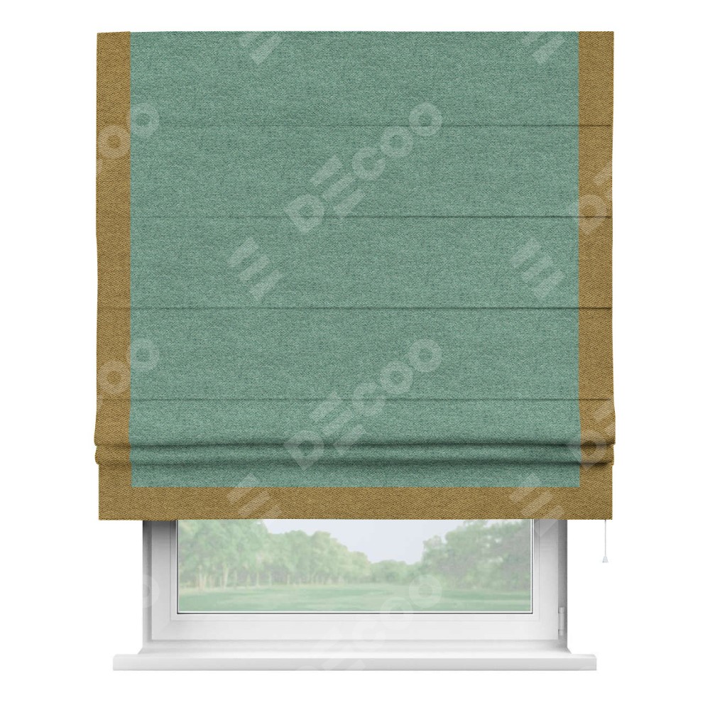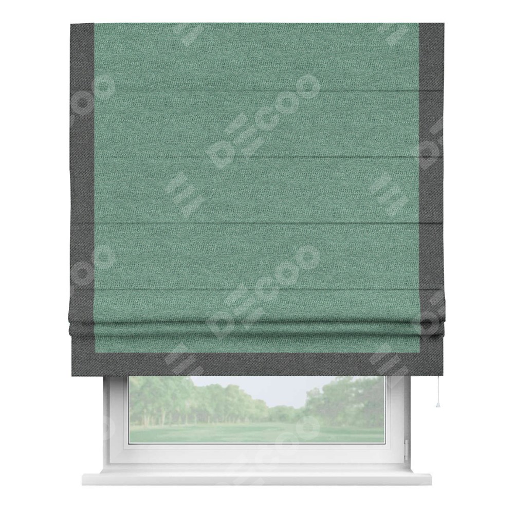 Римская штора производителя «Cortin», используется для проёма, пошита из ткани твид блэкаут бирюзовый, артикул 90934. Отделка шторы кантом «Виктория», ткань для канта используется из твида разной расцветки на выбор. Имеет универсальный механизм и подходит для монтажа: на потолок, на стену и в нишу.