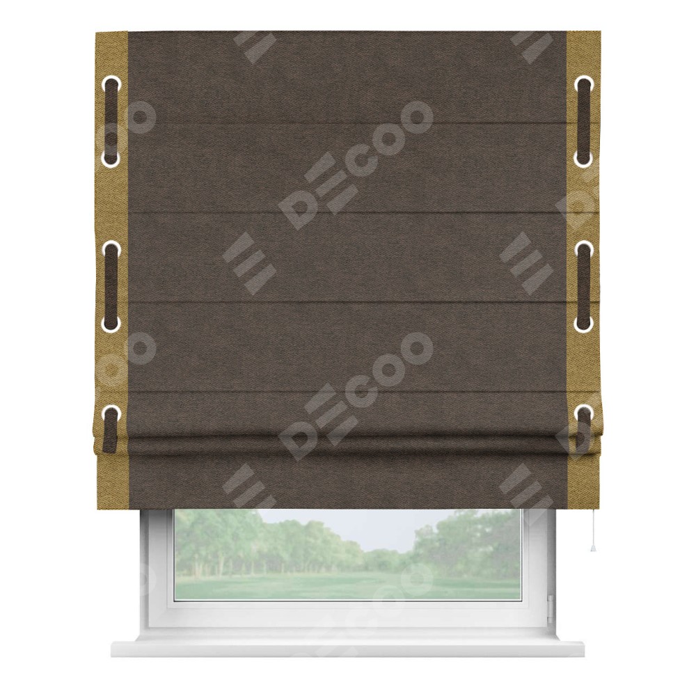 Римская штора производителя «Cortin», используется для проёма, пошита из ткани твид блэкаут тёмно-коричневый, артикул 90933. Отделка шторы кантом «Стрим Дуо» на кантах расположены люверсы с пояском, ткань для канта используется из твида разной расцветки на выбор. Ткань для пояска обычно используется из основной ткани шторы, а так же можно сделать из любой расцветки по желанию. Имеет универсальный механизм и подходит для монтажа: на потолок, на стену и в нишу.