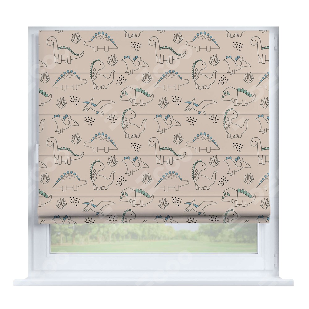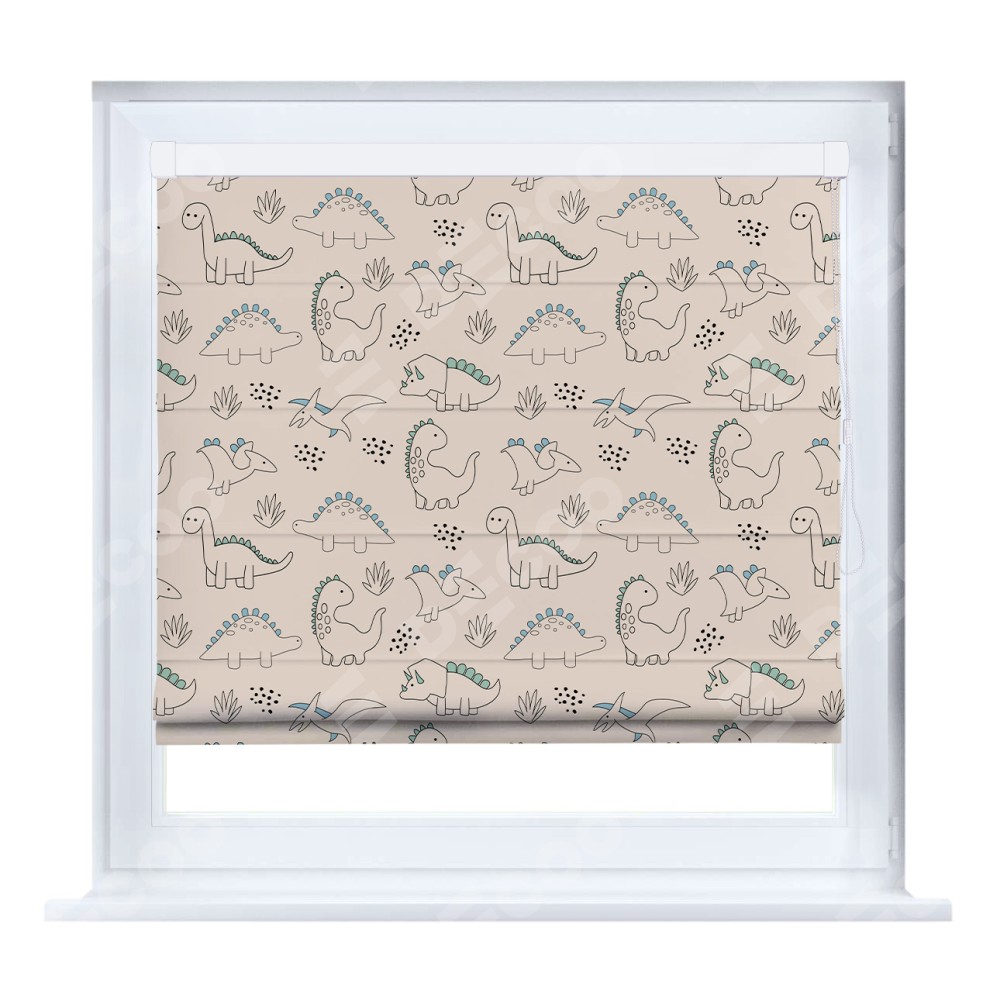 Римская штора производителя «Cortin», устанавливается на створку окна, пошита из ткани блэкаут с нанесением сублимационной печати «Динозаврики». Штора шьётся по индивидуальным размерам, для данного типа римской шторы возможная ширина от 35 до 150 см., высота до 250 см.