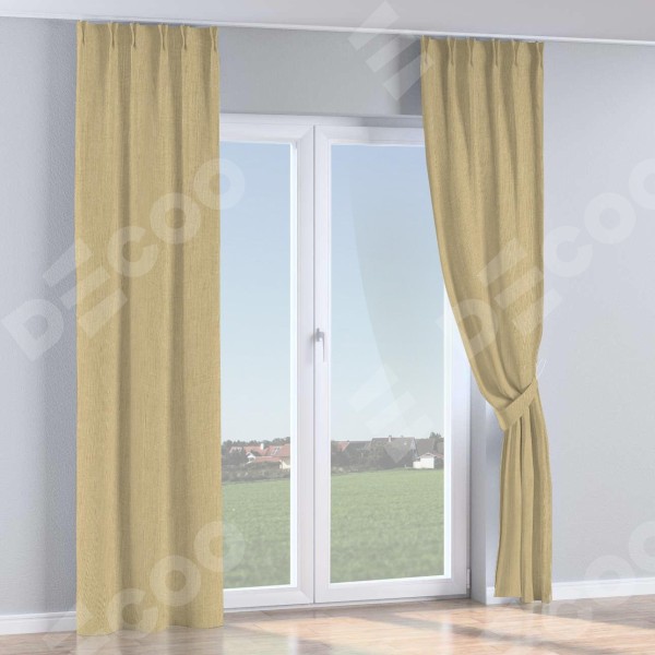 Комплект прямых штор, от производителя «Cortin», пошиты из ткани лён димаут песочный, артикул ткани 16256. С изнаночной стороны в верхней части штор пристрачивается шторная лента с декоративными складками «Кустик». Для создания элегантных складок прямые шторы шьются по стандарту с коэффициентом 1:2 (на 100 см. ширины проёма 200 см. ширины ткани).