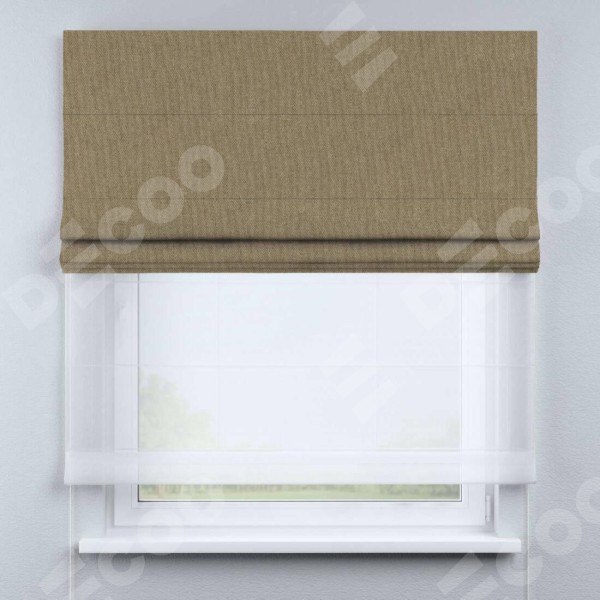Двойная римская штора «День-ночь» от производителя Cortin предназначена для использования в проёмах. Эта штора уникальна тем, что состоит из двух полотен. На лицевой стороне находится лён димаут тёмно-бежевый (артикул: 16261), обеспечивающий эффективное затемнение. В комплект также входит вторая ткань — легкий белый тюль (артикул: V-01), который добавляет изящества и легкости оформлению окна. Кроме того, доступны и другие разновидности ткани тюль, выбор которых доступен по ссылке .