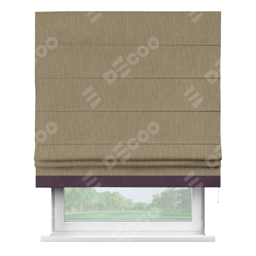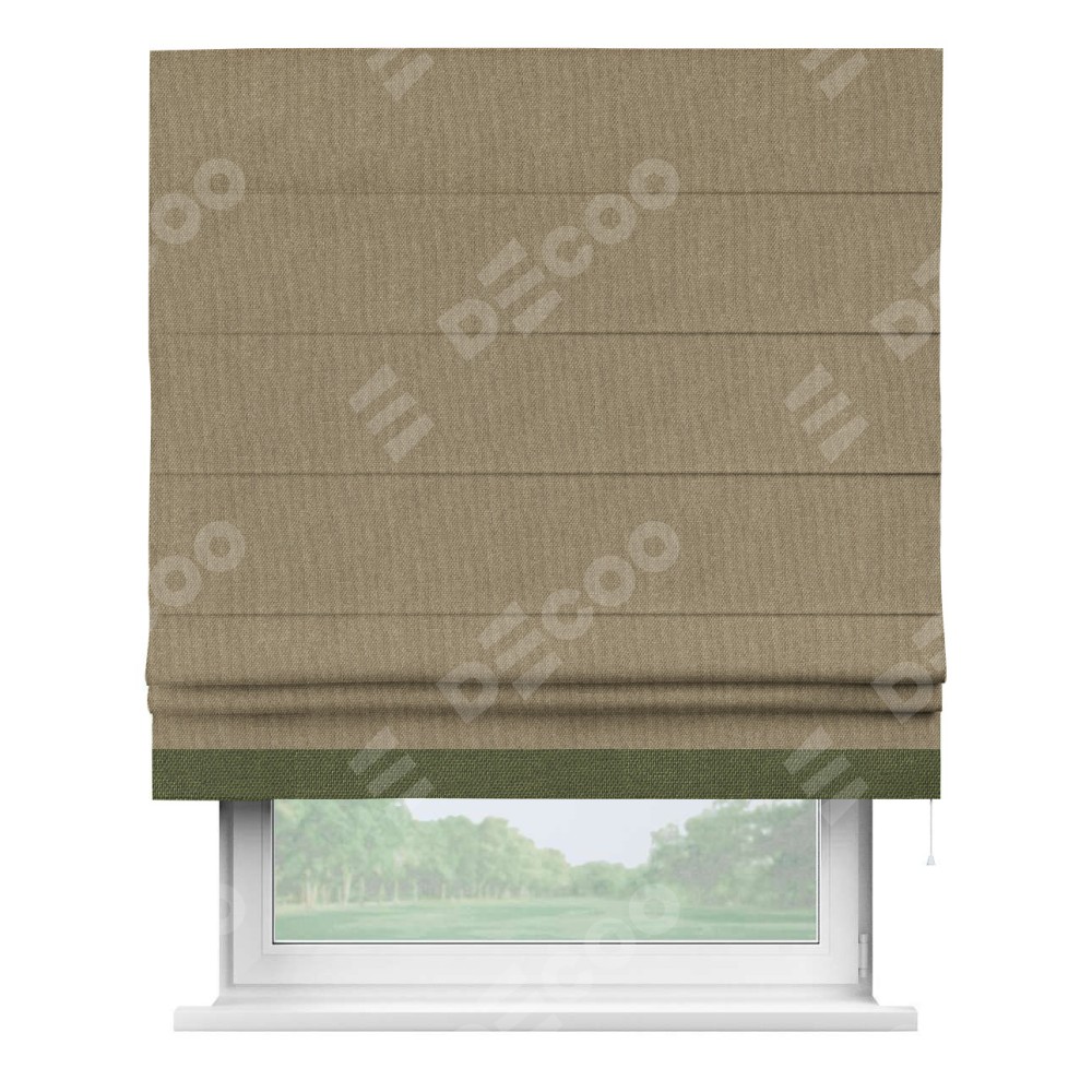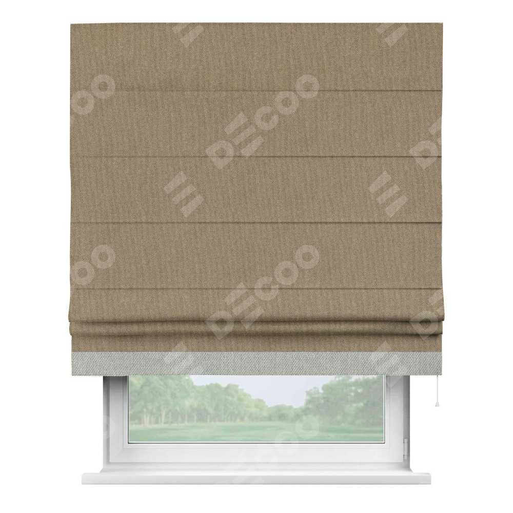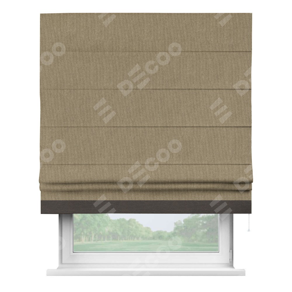 Римская штора пошита из ткани лён димаут тёмно-бежевый, артикул: 16261, с отделкой кантом «Джестер» выделяется своей уникальной особенностью — кантом, расположенным только снизу шторы. Этот дизайн добавляет оригинальности и игривости оконному оформлению, делая акцент на нижней части шторы и создавая интересный визуальный эффект. Отделка кантом на нижнем крае не только служит эстетической функции, но и способствует увеличению прочности и износостойкости ткани в этом месте.