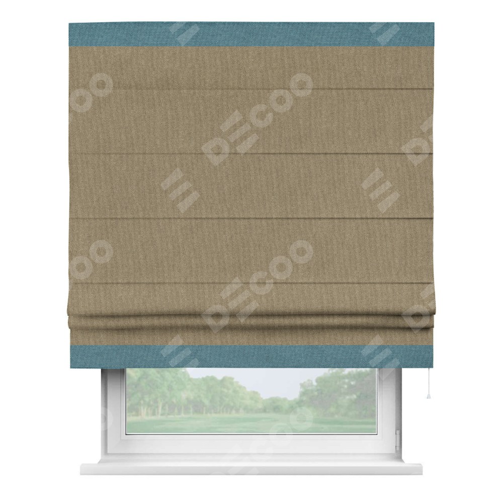 Римская штора пошита из ткани лён димаут тёмно-бежевый, артикул: 16261, с отделкой кантом «Горизонт» предлагает уникальное дизайнерское решение, при котором кант располагается только вверху и снизу шторы. Такое решение делает акцент на горизонтальных линиях, визуально расширяя пространство и придавая окну более строгий и организованный вид. Отделка кантом в этих ключевых местах не только украшает штору, но и способствует её долговечности, защищая наиболее уязвимые к износу края.