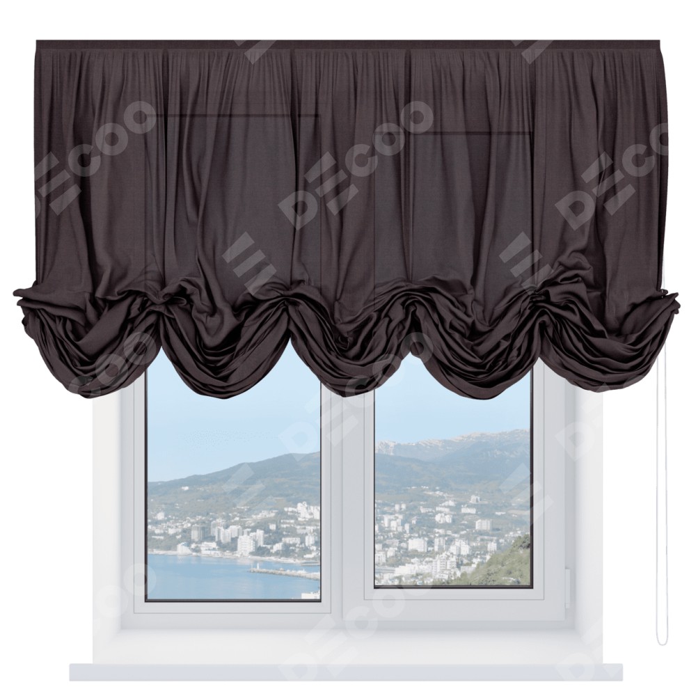 Австрийская штора производителя «Cortin», используется для проёма, пошита из ткани лён коричневый, артикул ткани 53443. Имеет универсальный механизм и подходит для монтажа: на потолок и на стену.