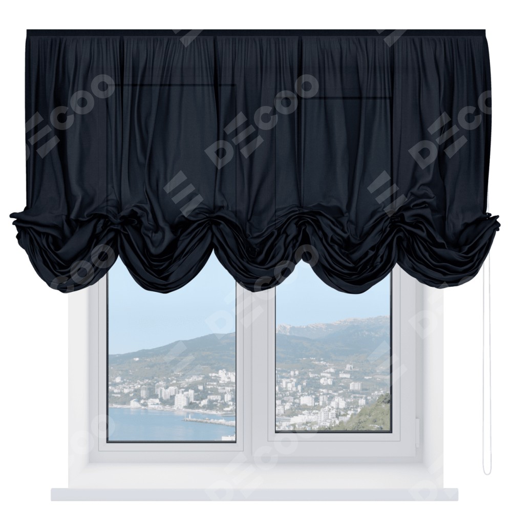 Австрийская штора производителя «Cortin», используется для проёма, пошита из ткани лён черный, артикул ткани 85927. Имеет универсальный механизм и подходит для монтажа: на потолок и на стену.