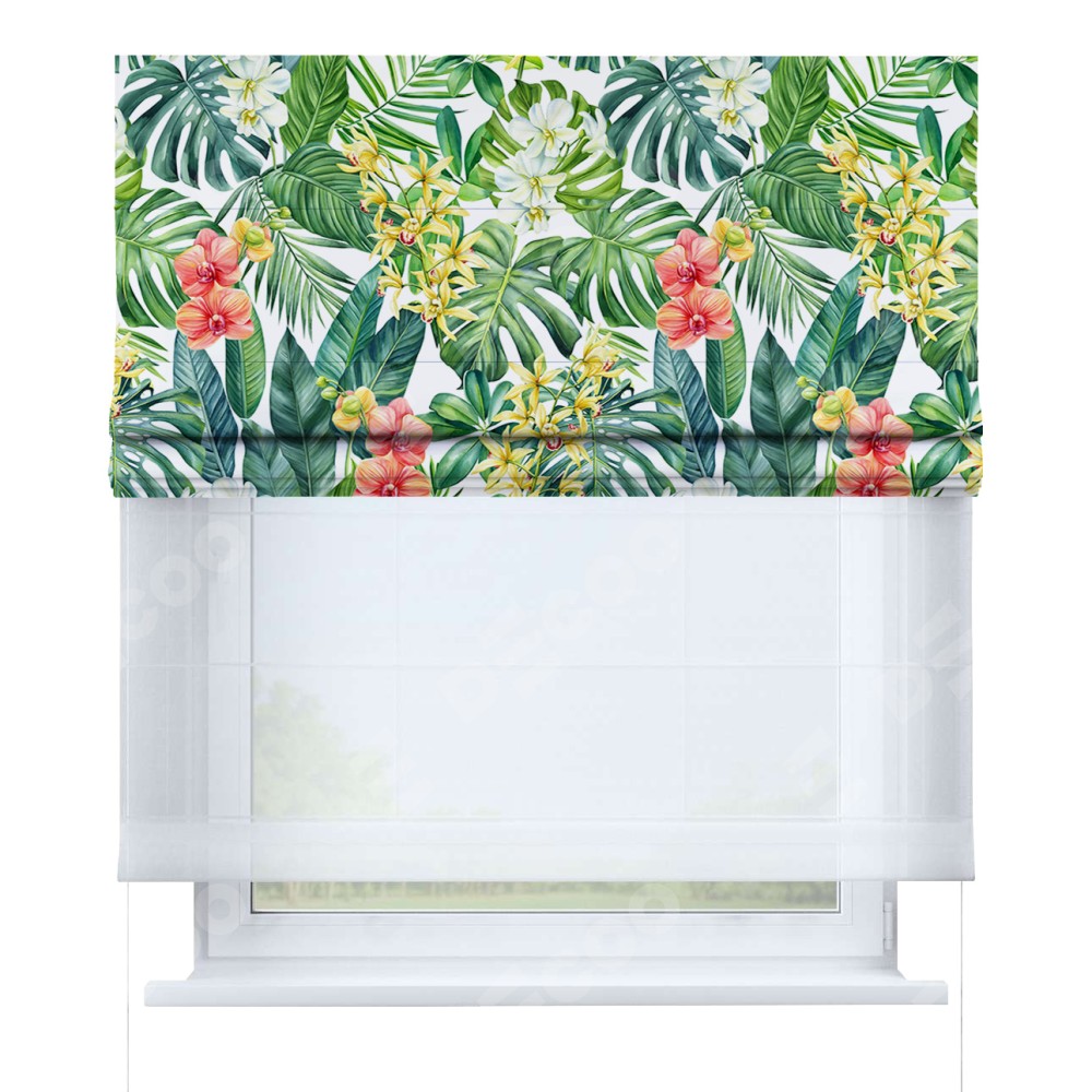 Двойная римская штора «День-ночь» от производителя Cortin предназначена для использования в проёмах. Эта штора уникальна тем, что состоит из двух полотен. На лицевой стороне находится блэкаут с нанесением сублимационной печати «Орхидеи в тропиках», обеспечивающий эффективное затемнение. В комплект также входит вторая ткань — легкий белый тюль (артикул: V-01), который добавляет изящества и легкости оформлению окна. Кроме того, доступны и другие разновидности ткани тюль, выбор которых доступен по ссылке .