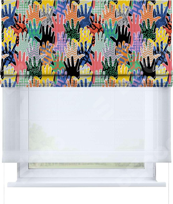 Двойная римская штора «День-ночь» от производителя Cortin предназначена для использования в проёмах. Эта штора уникальна тем, что состоит из двух полотен. На лицевой стороне находится блэкаут с нанесением сублимационной печати «Коллаж поп-арт», обеспечивающий эффективное затемнение. В комплект также входит вторая ткань — легкий белый тюль (артикул: V-01), который добавляет изящества и легкости оформлению окна. Кроме того, доступны и другие разновидности ткани тюль, выбор которых доступен по ссылке .
